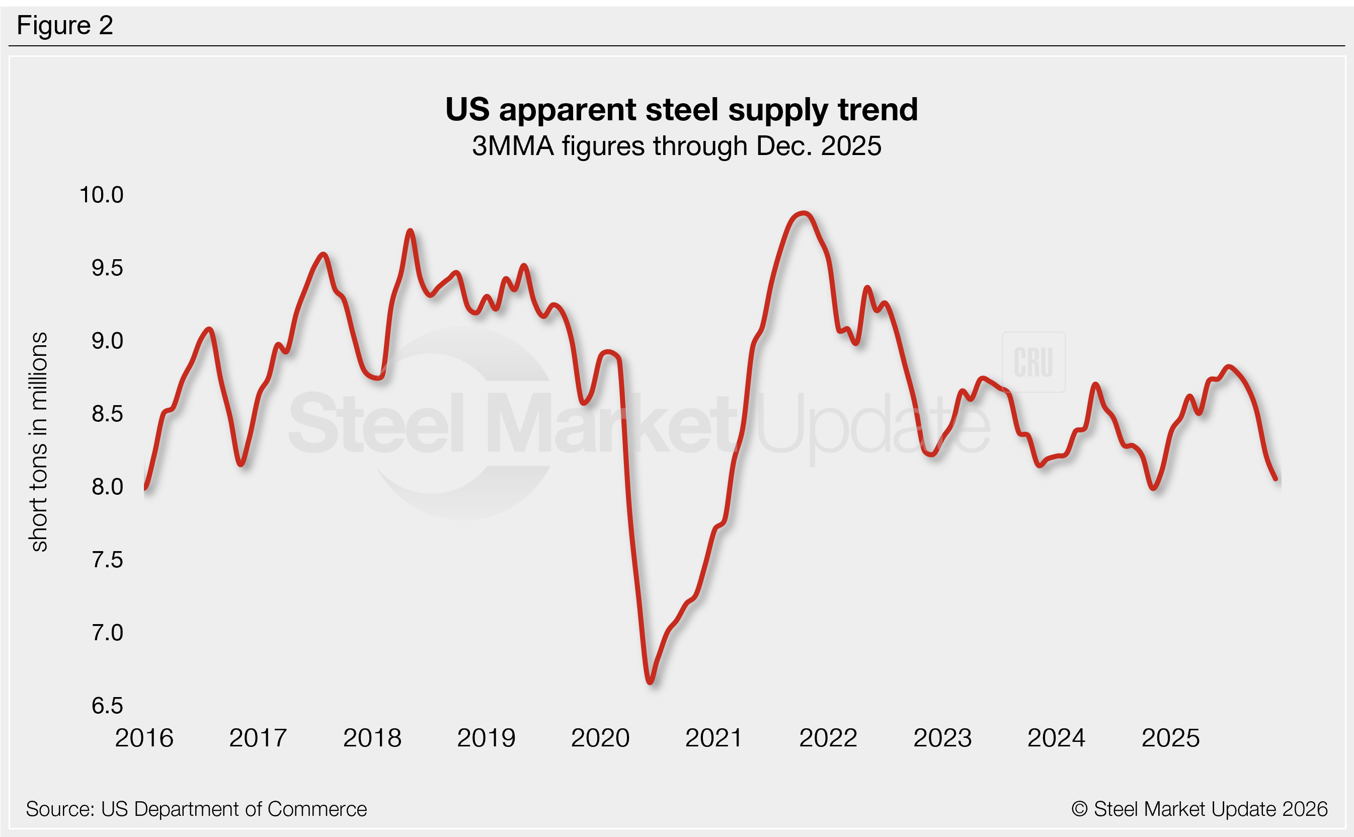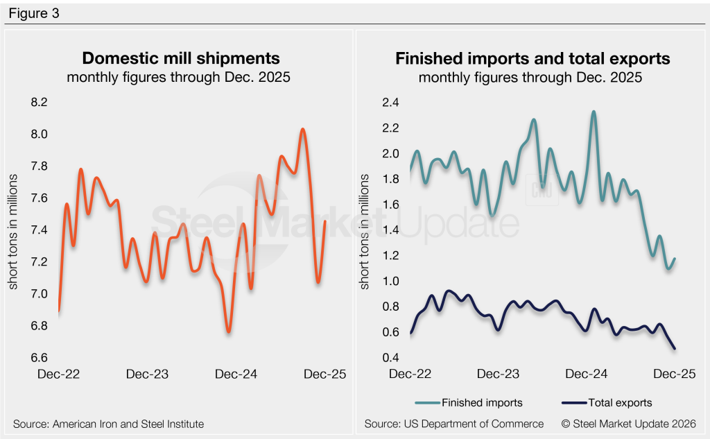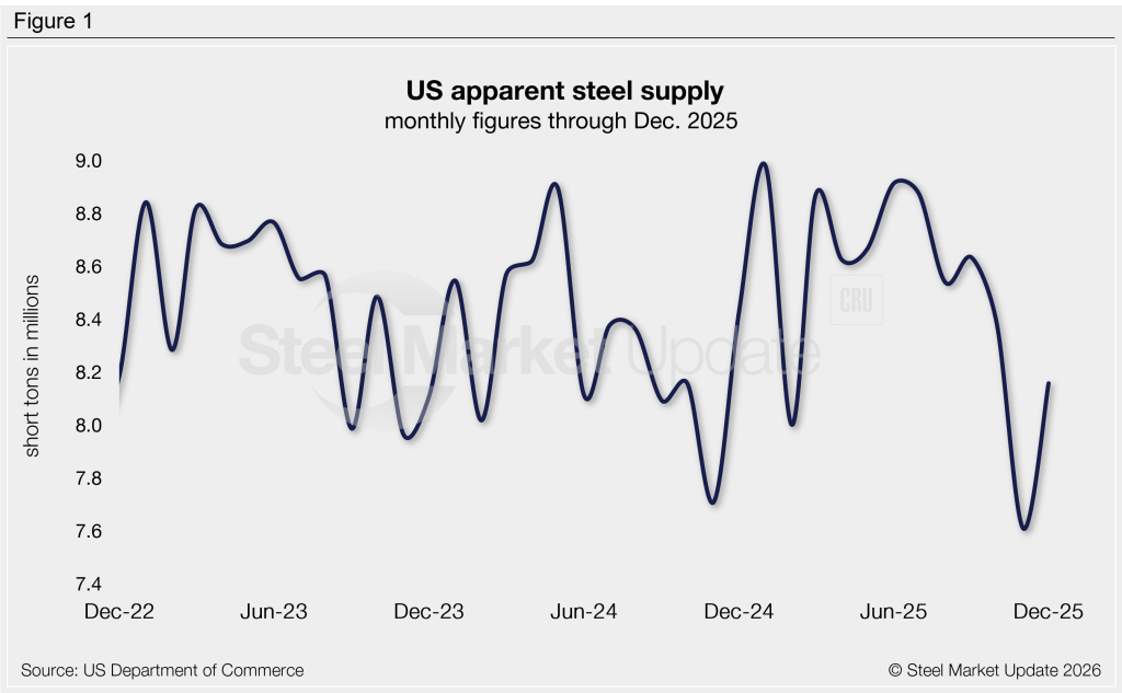 The amount of finished steel that entered the US market in December recovered 7% from the near five-year low recorded one month prior, according to SMU’s analysis of recently released Department of Commerce and American Iron and Steel Institute (AISI) data. Dubbed apparent steel supply, this measure is calculated by combining domestic mill shipments and finished US steel imports, then subtracting total US exports.