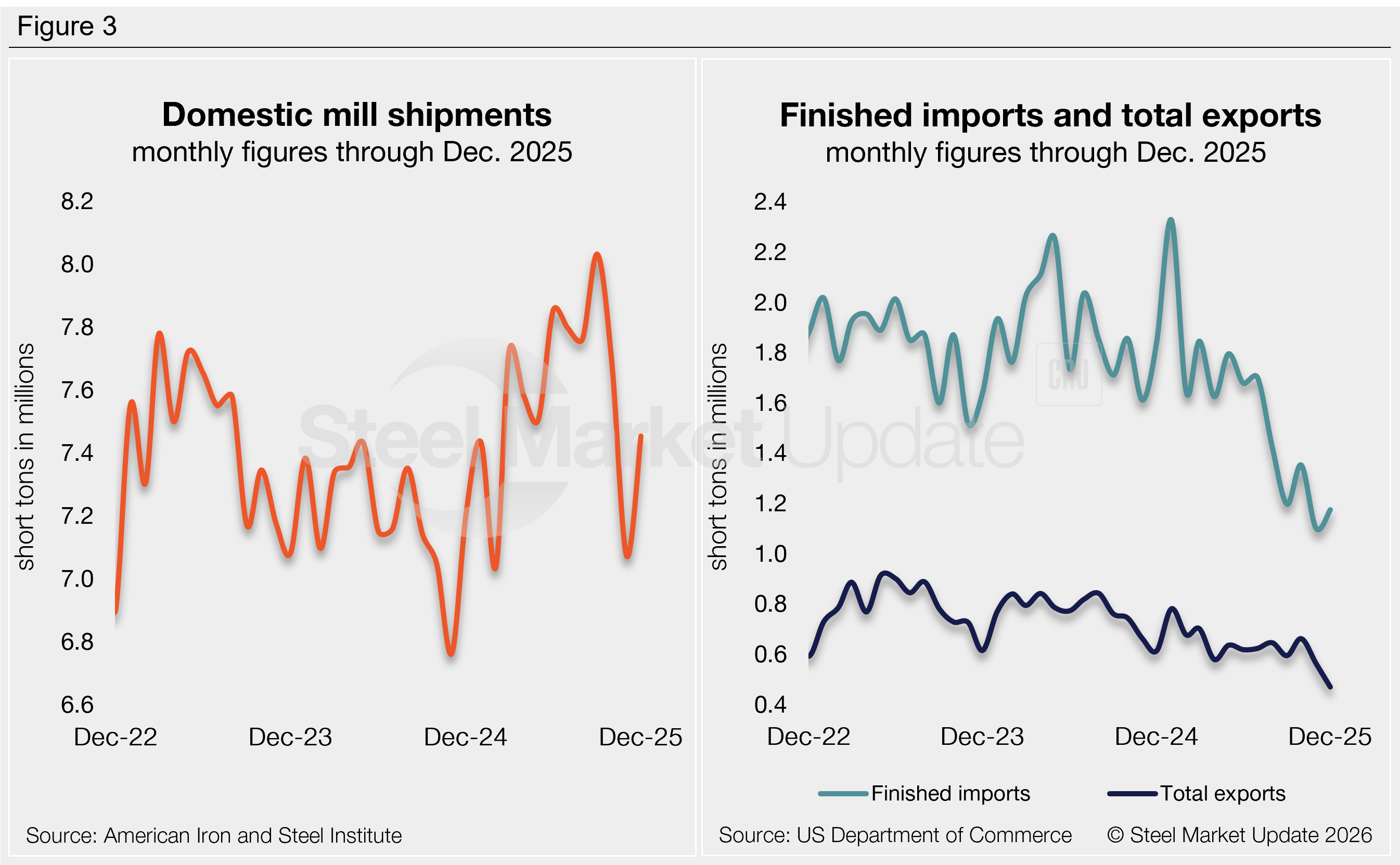 December supply increased by 548,000 short tons (st) from November to 8.16 million st, the third-lowest monthly rate of 2025 (Figure 1). This comes one month after supply fell to 7.61 million st, the lowest measure recorded since February 2021. The December recovery was primarily driven by an increase in domestic mill shipments, coupled with a rise in finished imports and a slowdown in exports.