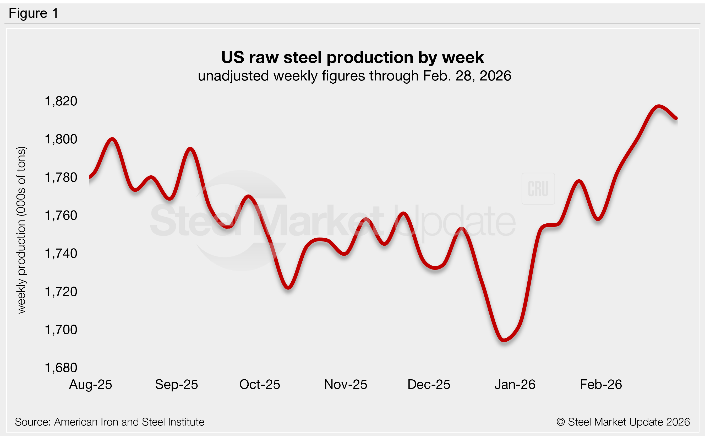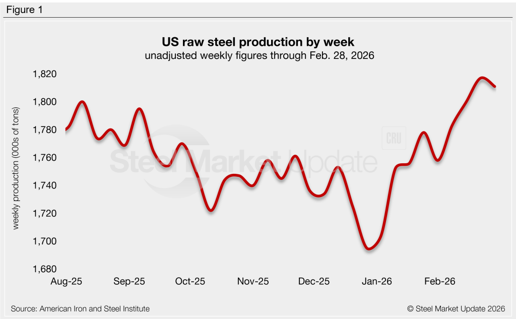 US mills produced an estimated 1,811,000 short tons (st) of raw steel in the week ending Feb. 28, down 6,000 st, or 0.3%, from the previous week’s high (Figure 1).