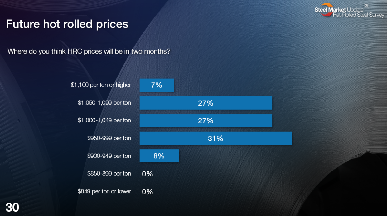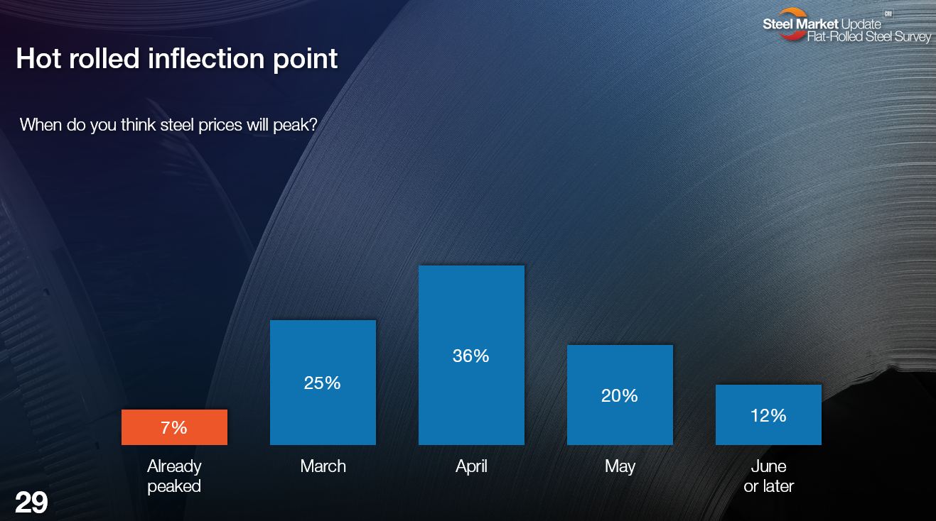 Most survey respondents (68%) think hot-rolled (HR) coil prices won’t peak until Q2. And even if a substantial minority (25%) think prices will peak later this month, only a fraction (7%) thinks prices have already peaked.