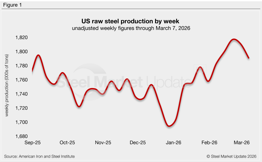 Domestic raw steel production was estimated at 1,791,000 short tons (st) in the week ending March 6, a reduction of 20,000 st, or 1.1%, from the previous week (Figure 1). Compare this to the mid-February peak of 1,817,000 st, the strongest rate recorded in four years.