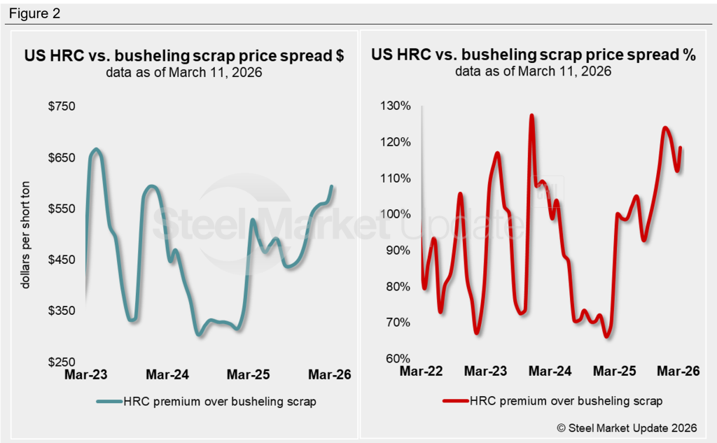 After converting scrap prices to dollars per short ton for an equal comparison, the differential between HRC and busheling scrap prices was $594/st as of Wednesday, March 11. That’s an increase of $30/st from a month earlier. The last time it touched this mark was December 2023 (Figure 2).