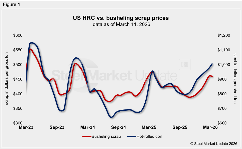 SMU’s average HRC price was $1,005 per short ton (st), FOB mill, east of the Rockies, as of Tuesday, March 10. That’s unchanged from the previous week but up $30/st from a month earlier.