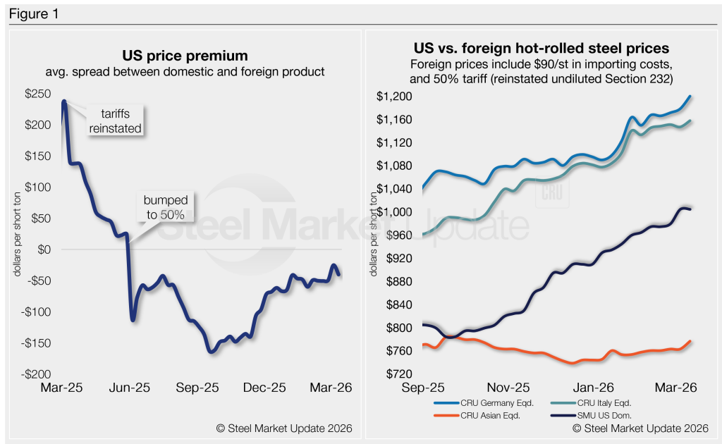 The result: Prices for US-produced HR are theoretically $228/st higher than steel imported from Asia — down ~$13/st w/w but up $14/st vs. last month.