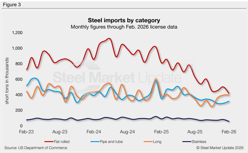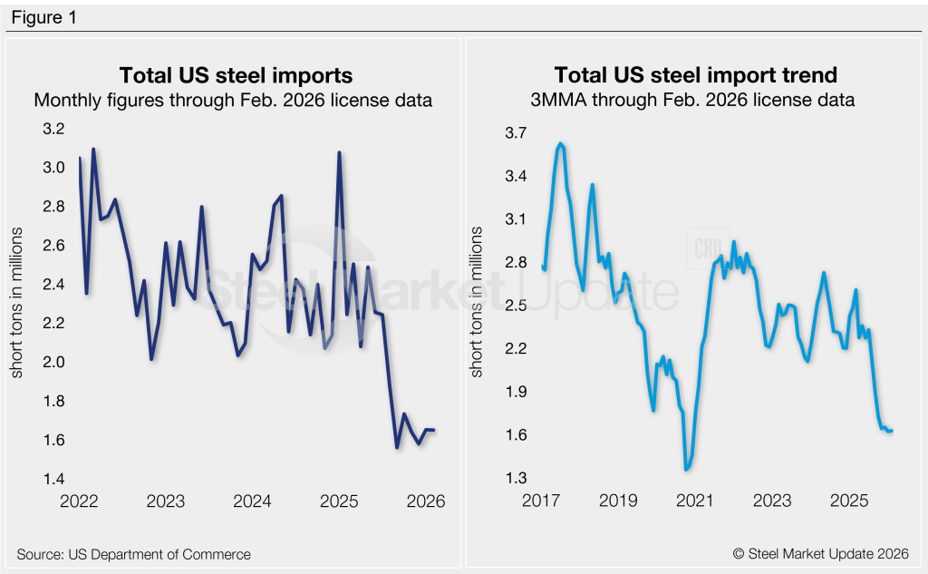 The total volume of steel products imported into the country in January was 1.65 million short tons (st), just ~90,000 st above the near five-year low set last September. February license data collected through March 10 is almost identical to January levels.