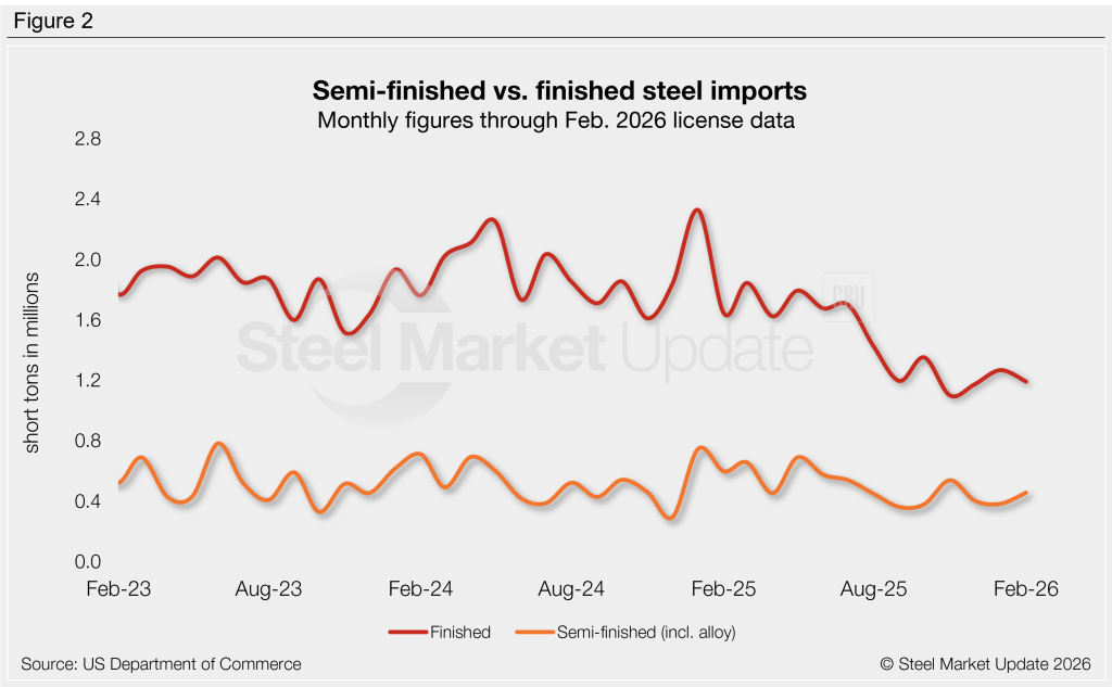 Imports of finished steel vs. semi-finished products (mostly slabs to be further processed by a mill) have moved in differing directions in recent months (Figure 2).