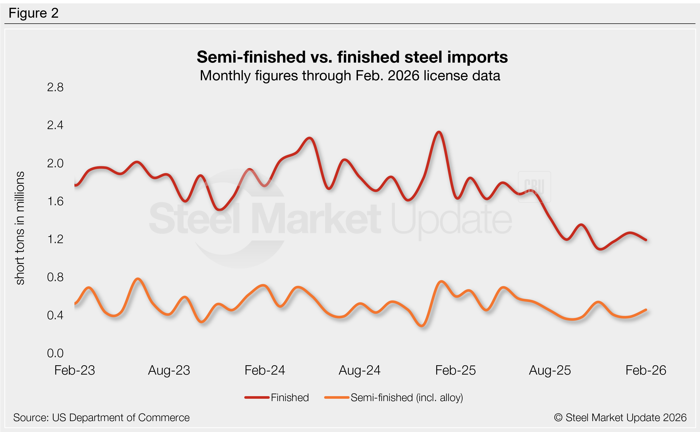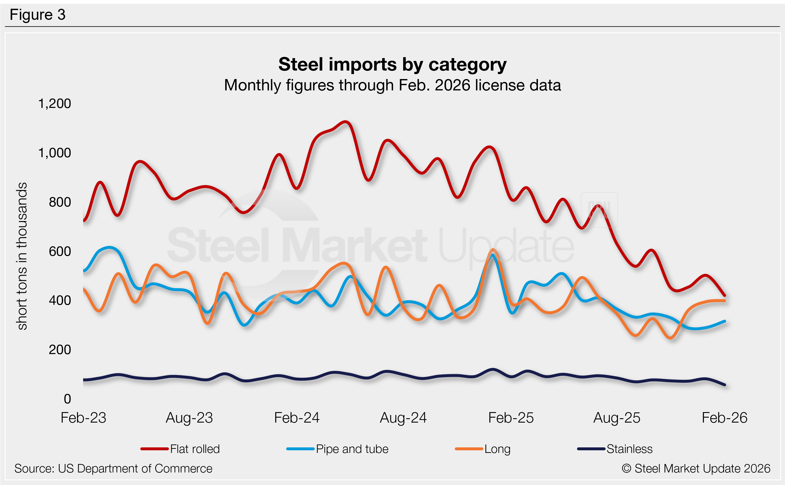 Finished imports increased 8% in January to 1.27 million st. This is similar to trade levels of the prior four months, but substantially lower than recent years (2024 averaged 1.89 million st). February licenses are down 6%.