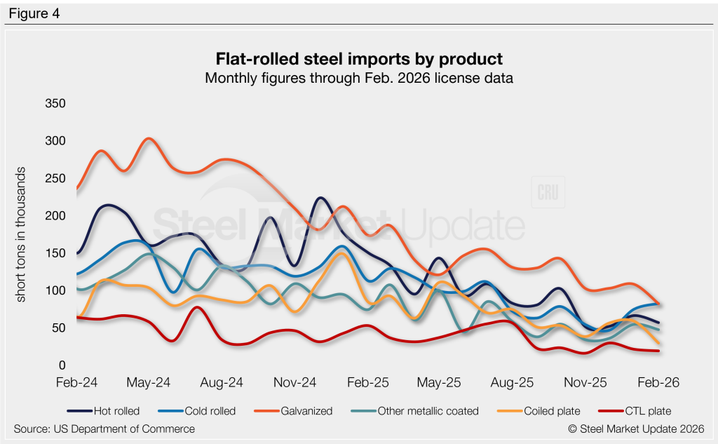 Figure 4 tracks flat-rolled imports for six popular sheet products. January trade increased for most products, while February figures are mostly down. Key highlights: