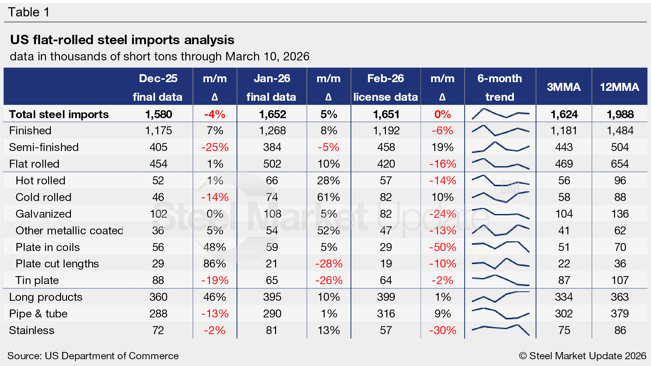 Table 1 highlights high-volume steel product imports (click to expand). Note that the 3MMA and 12MMA columns are calculated through final January data and do not include February licenses. For deeper analysis, visit our Steel Imports page.
