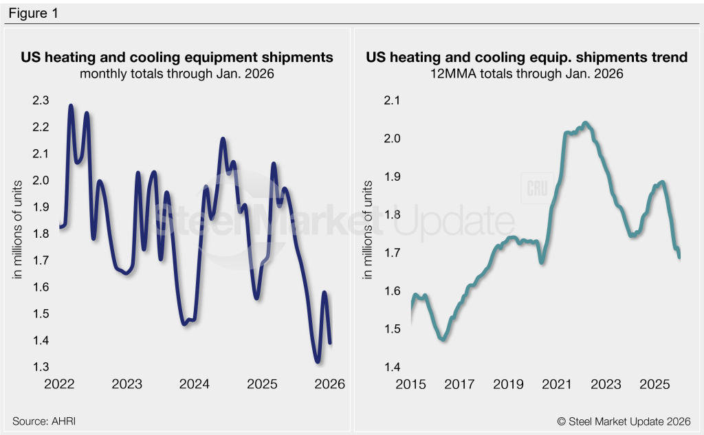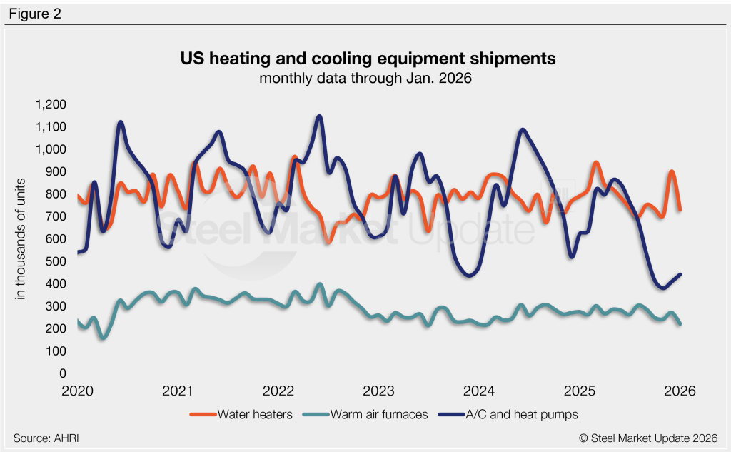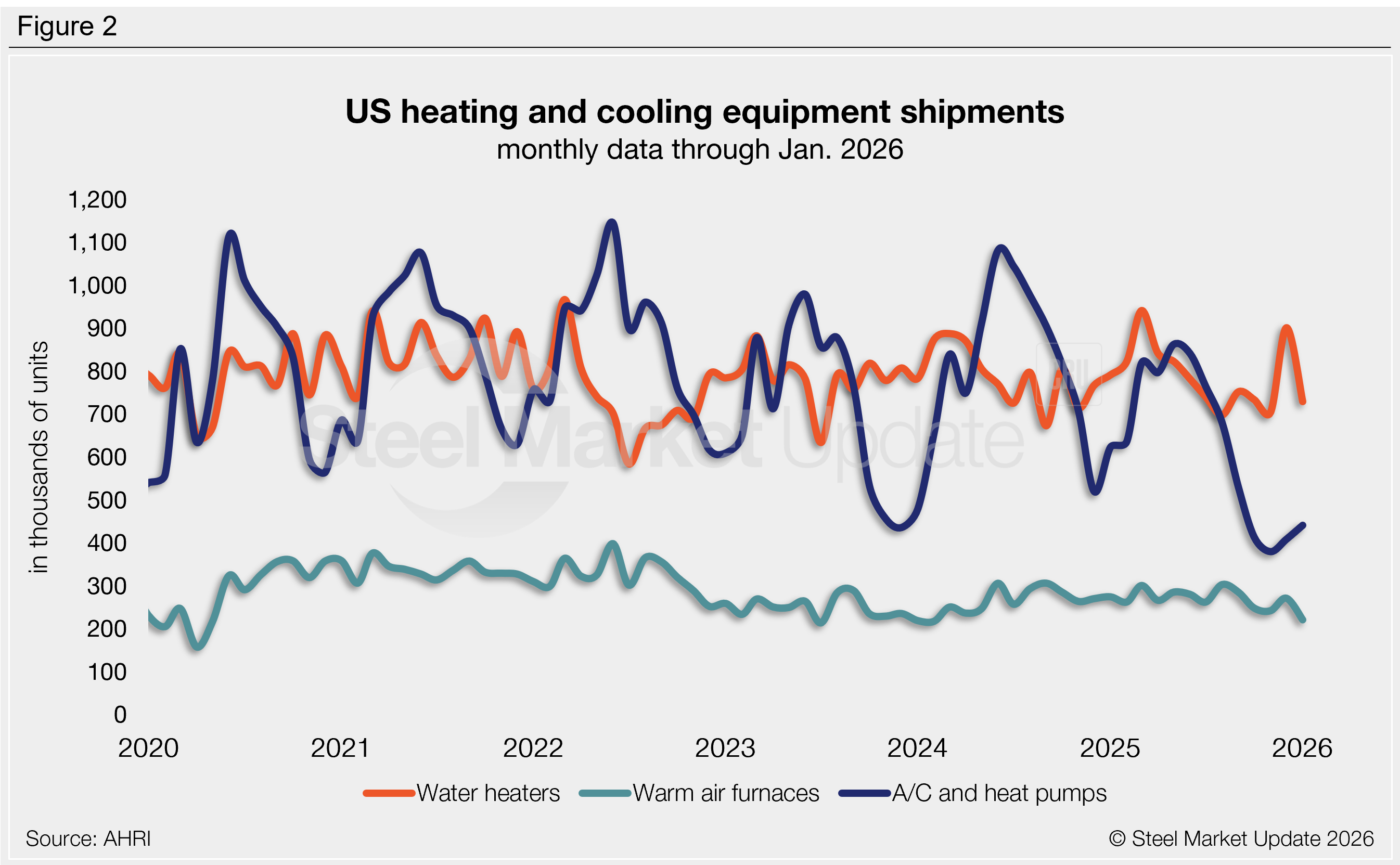January shipments totaled 1.39 million units, 18% lower than the same month last year (Figure 1, left). Shipments of water heaters and warm-air furnaces declined month over month (m/m), while air conditioners/heat pump shipments increased.