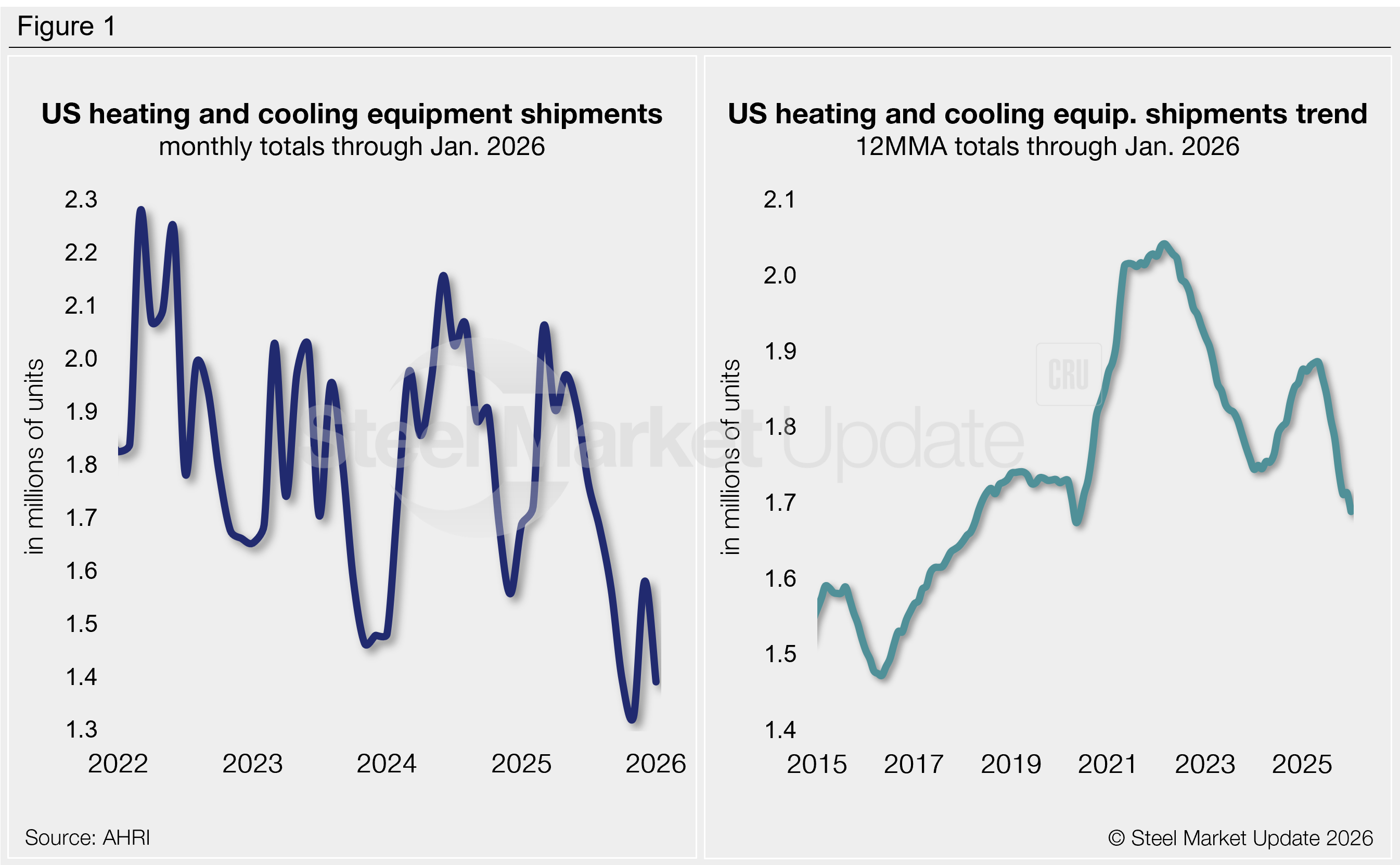Heating and cooling equipment shipments declined 12% from December to January, according to the latest data released by the Air-Conditioning, Heating, and Refrigeration Institute (AHRI).