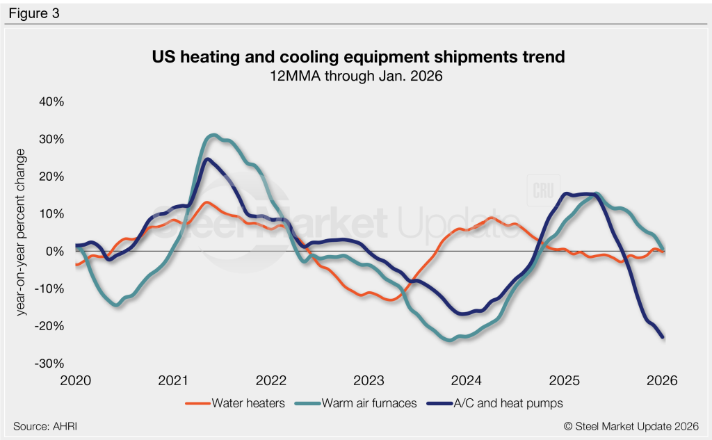 - Previously at a nine-month high, shipments of water heaters fell 19% m/m in January to 729,000 units, down 8% year over year (y/y).