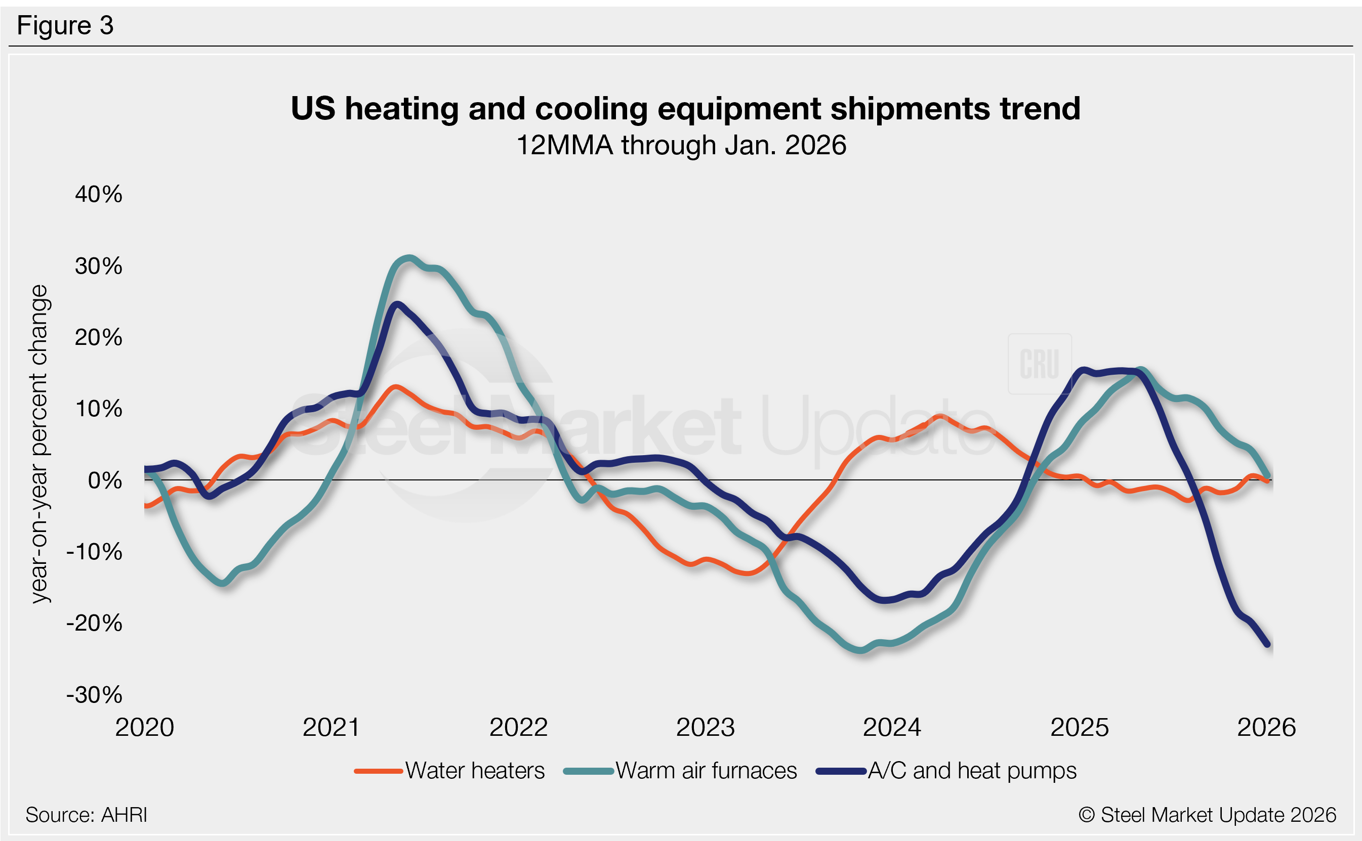 Figure 3 shows the annual growth rate of shipments by product on a 12MMA basis. From this angle, annualized warm-air furnace shipments remain strong, water heater shipments are relatively flat, and air conditioners/heat pumps shipments are down considerably: