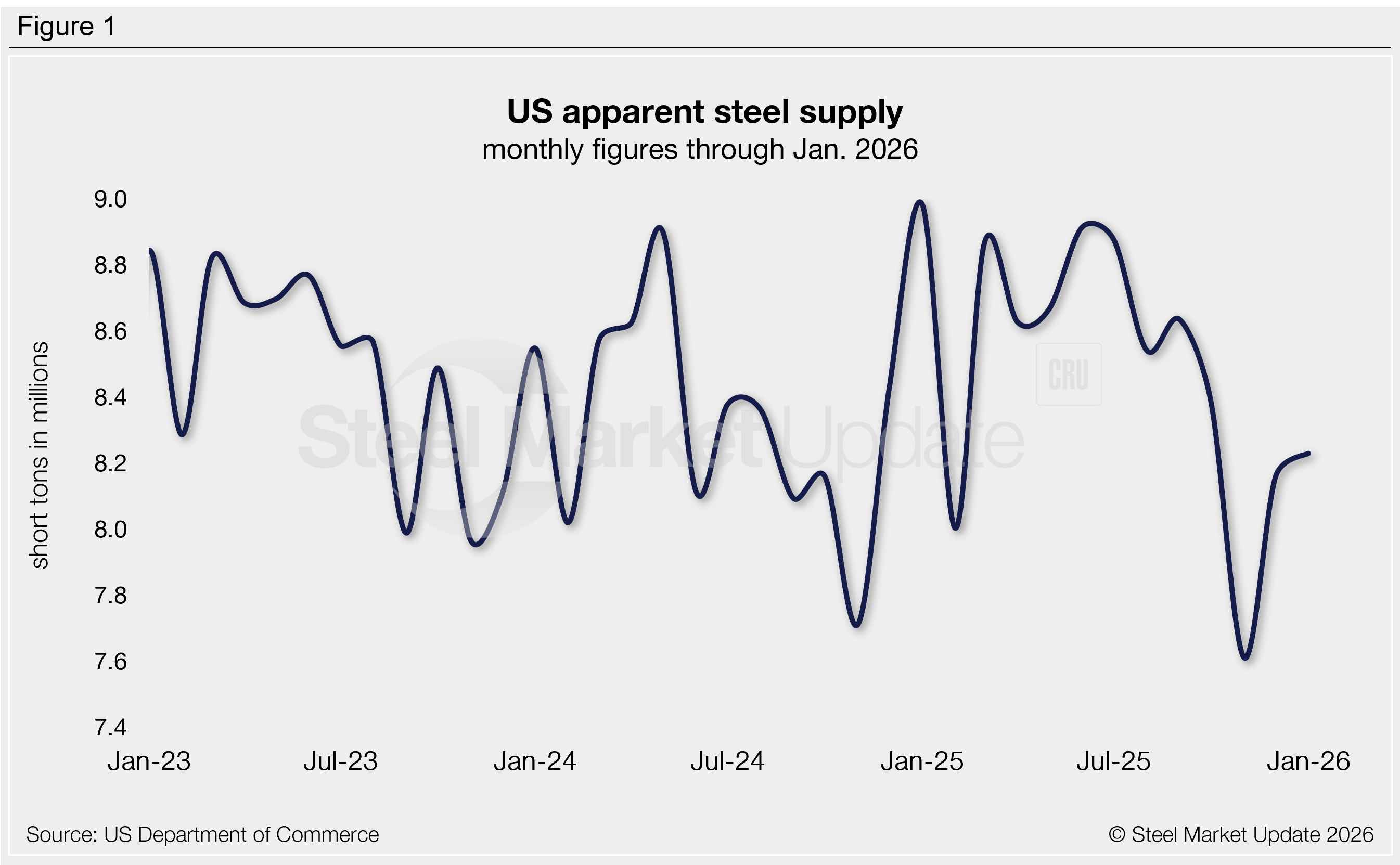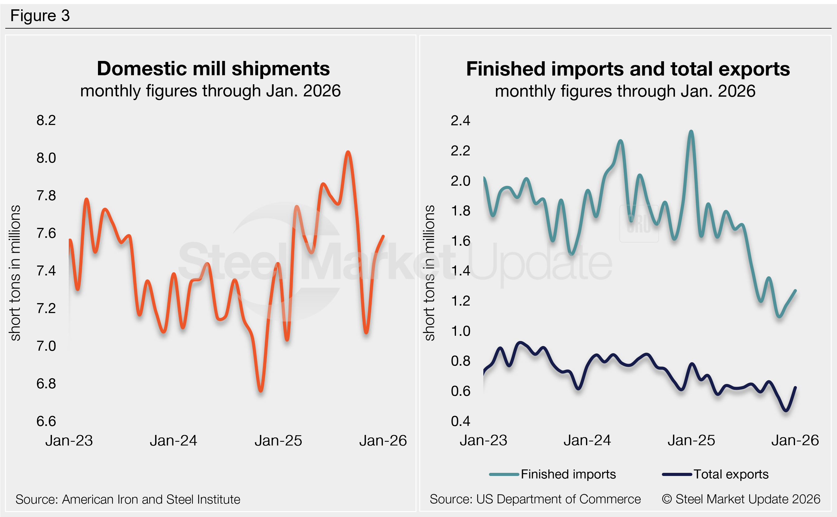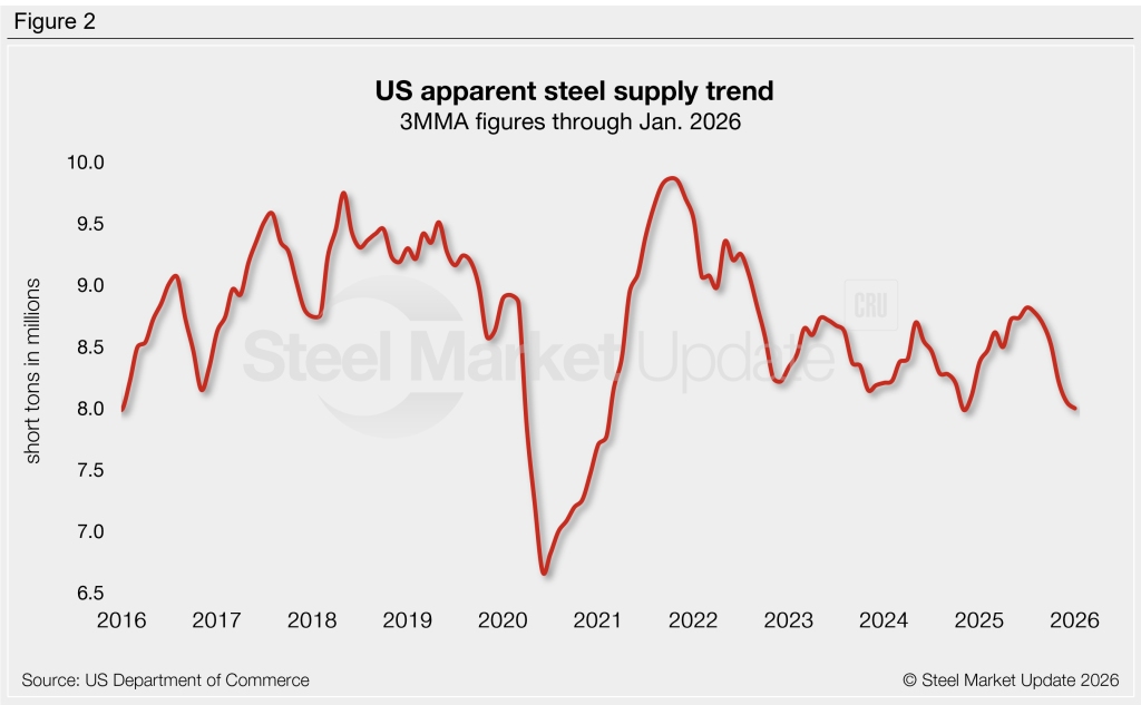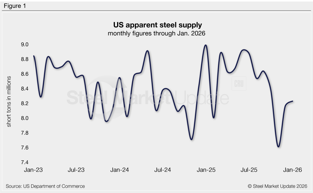 The volume of finished steel that entered the US market increased 1% from December to January, according to SMU’s analysis of recently released US Department of Commerce and American Iron and Steel Institute (AISI) data. Although up month over month (m/m), January supply remains on the low side compared to recent years, just 8% higher than the near five-year low set two months prior.
