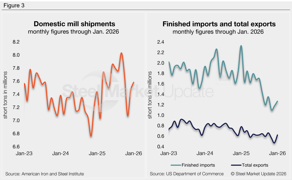 This apparent steel supply measure is calculated by combining domestic mill shipments and finished US steel imports, then subtracting total US exports.