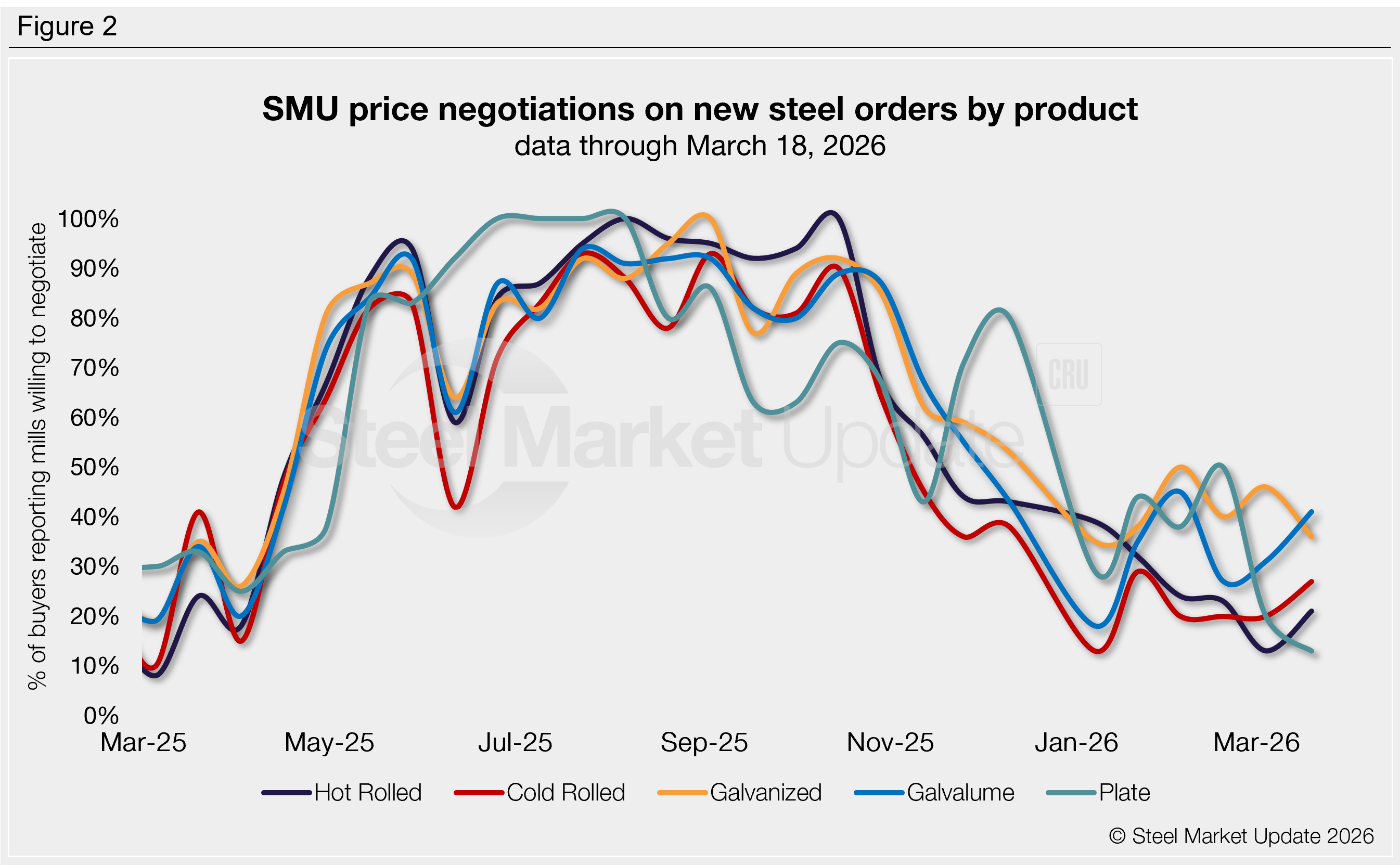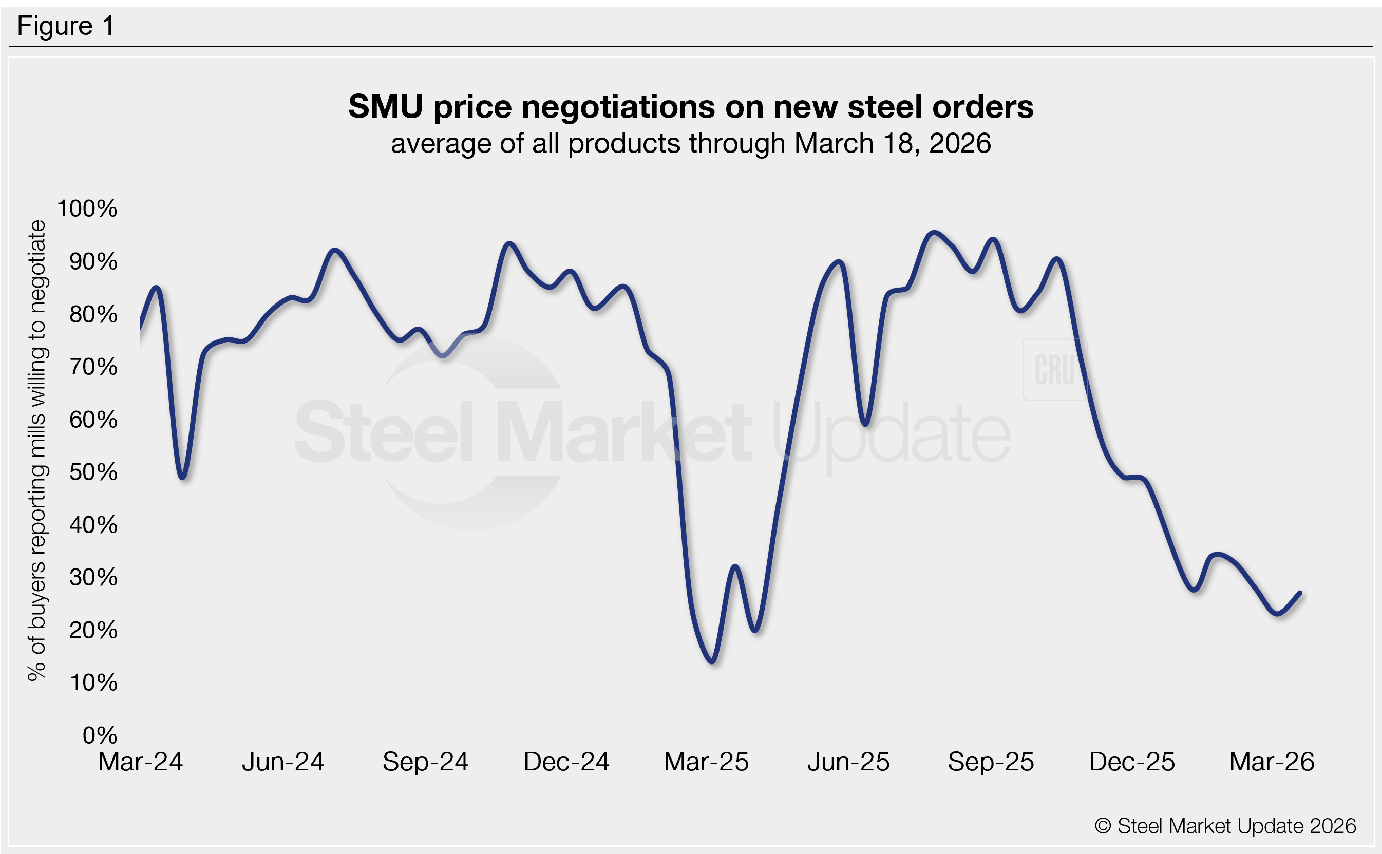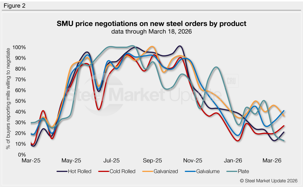 Every two weeks, SMU polls over 1,000 service center and manufacturer buyers to see whether mills are willing to negotiate pricing on new spot orders. Just over a quarter of this week’s respondents (27%) said mills were willing to talk price to secure an order (Figure 1). This is four points higher than our previous survey, which was the lowest rate recorded in nearly a year.