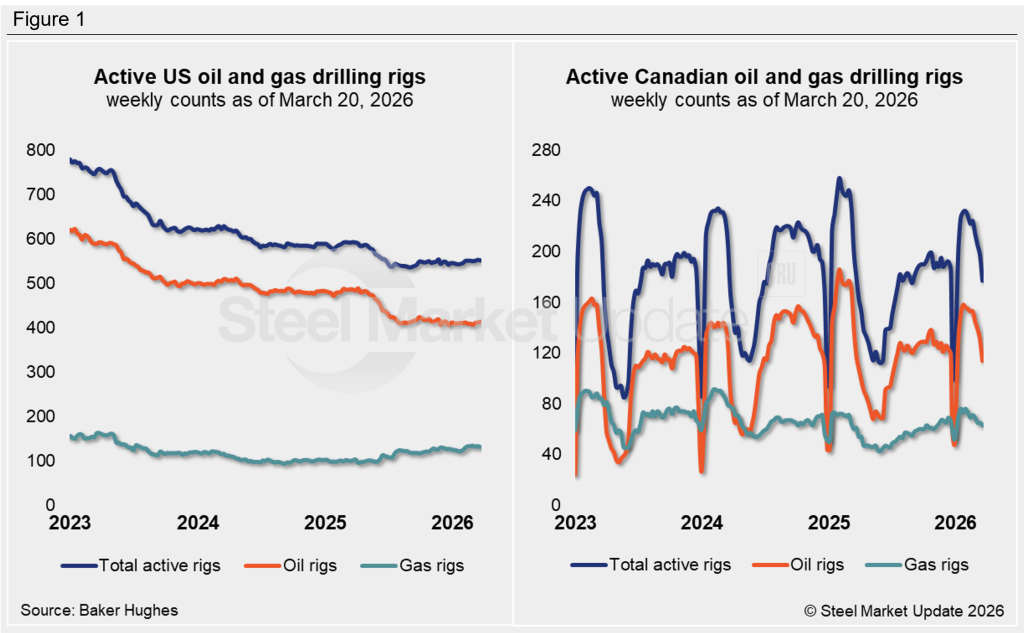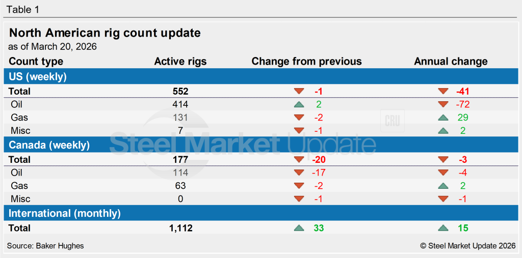 Oil and gas drilling in the US was basically steady in the week ended March 20, based on Baker Hughes‘ latest report on the number of rotary rigs in operation. Drilling in Canada, however, continued to slide, with the country seeing a steep decline in its rig count.