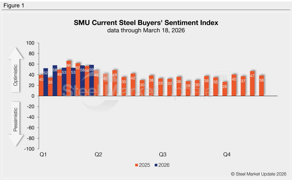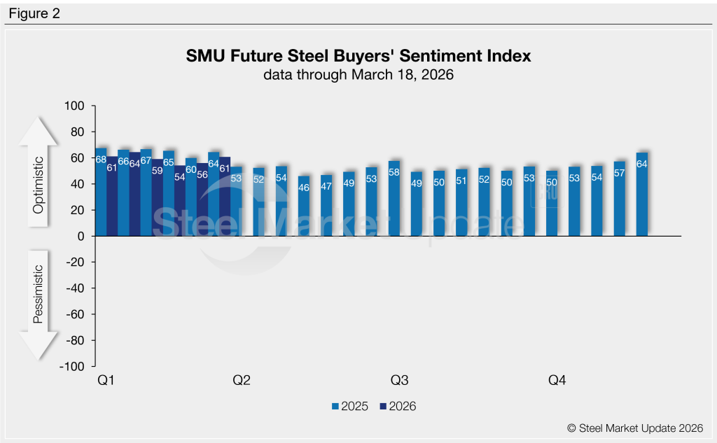 The SMU Steel Buyers’ Sentiment Index measures the attitude of buyers and sellers of flat-rolled steel products in North America. It is a proprietary product developed by Steel Market Update for the North American steel industry. Tracking steel buyers’ sentiment is helpful in predicting their future behavior. View our methodology here. If you would like to participate in our survey, please contact us at smu@crugroup.com.
