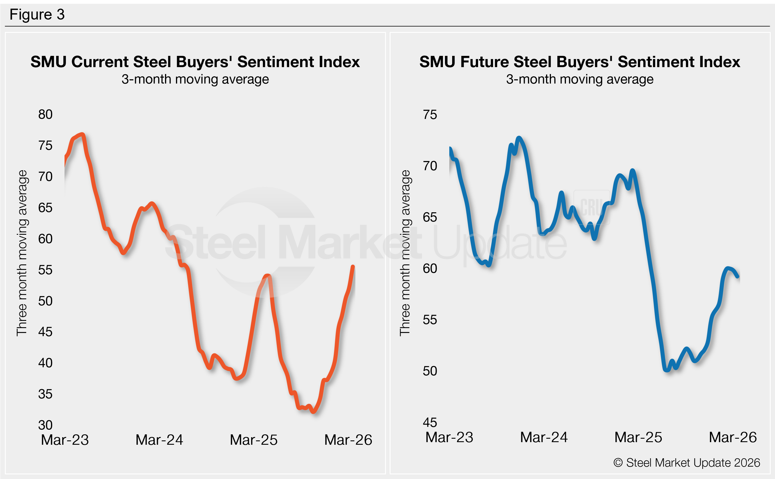 The SMU Steel Buyers’ Sentiment Index measures the attitude of buyers and sellers of flat-rolled steel products in North America. It is a proprietary product developed by Steel Market Update for the North American steel industry. Tracking steel buyers’ sentiment is helpful in predicting their future behavior. View our methodology here. If you would like to participate in our survey, please contact us at smu@crugroup.com.