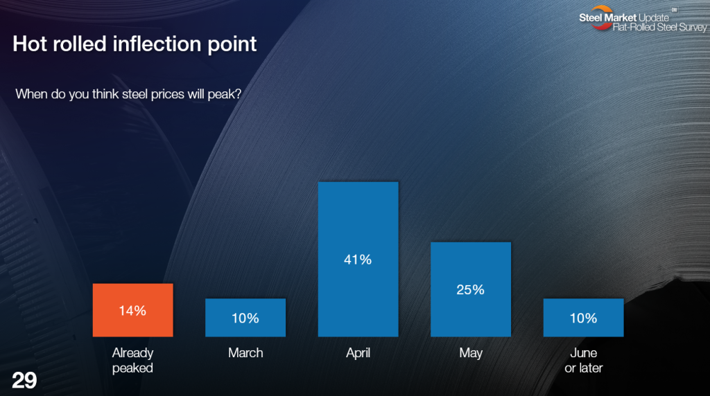 We’ll release March inventory data in mid-April. But we already have some idea of how companies are managing inventories from our last steel market survey. (Editor’s note: The page numbers below refer to where in our full survey deck SMU premium subscribers can find these results.)