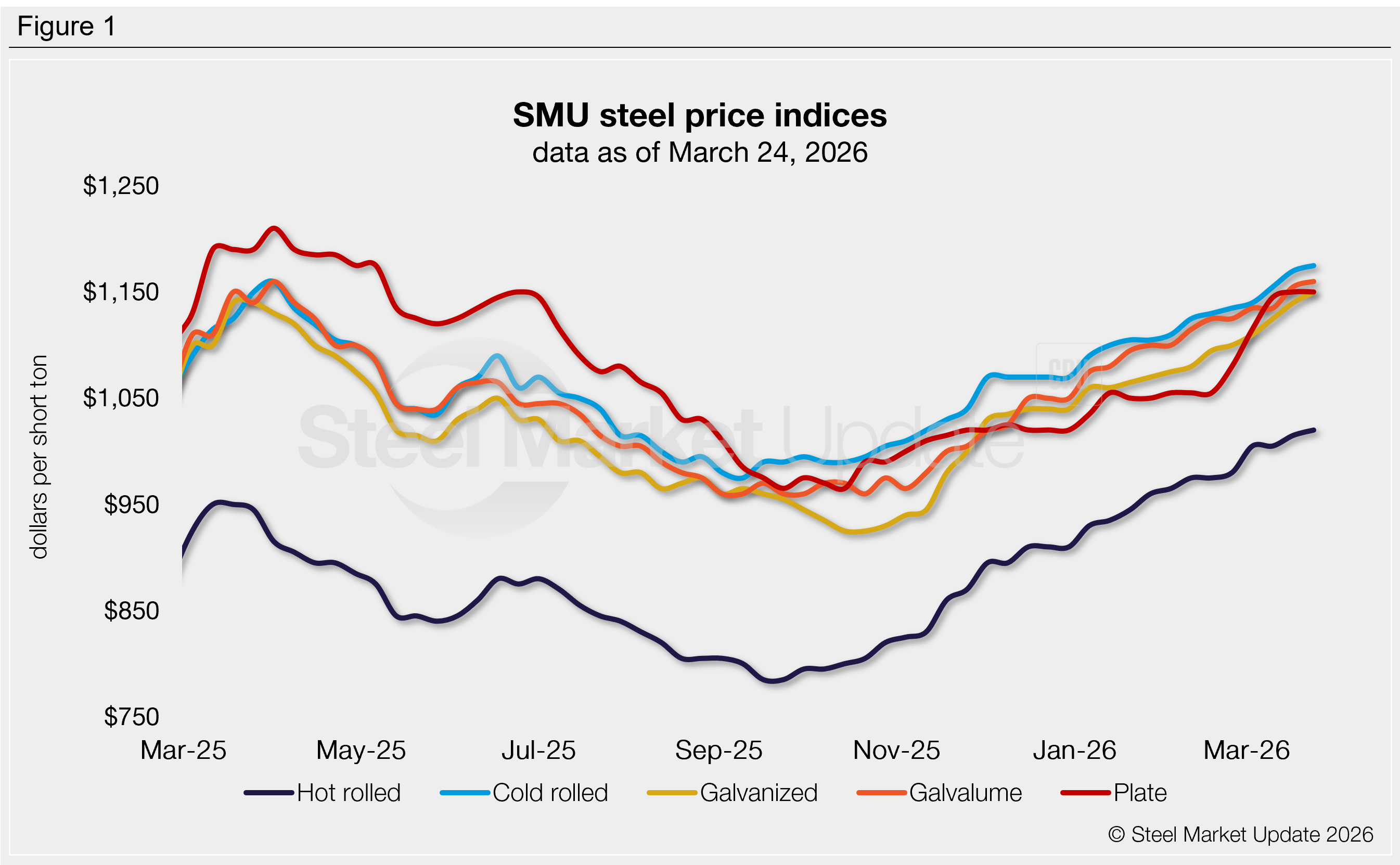 Plate was the outlier this week, holding at a 10-month high of $1,150/st.