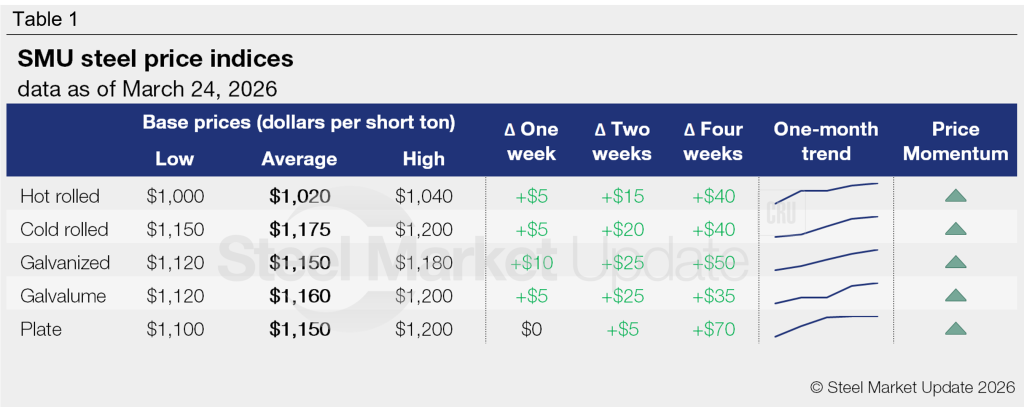 Hot-rolled coil: $1,000–1,040/st, averaging $1,020/st