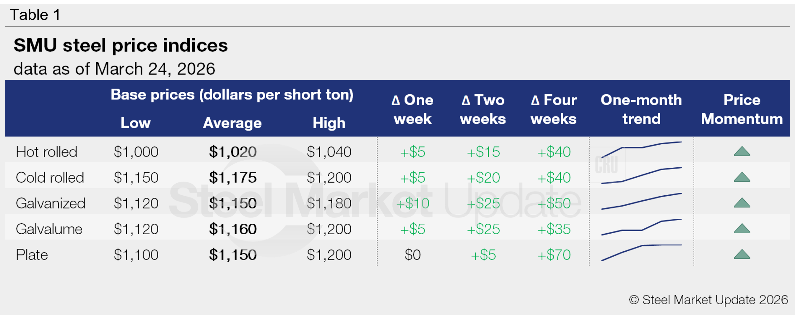 SMU’s price momentum indicator remains at higher for both sheet and plate products, signaling we expect prices to increase further in the short term.