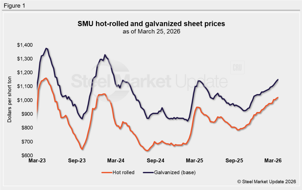 In this week’s pricing assessment, SMU pegged galvanized sheet products at $1,120 to $1,180 per short ton. The average of $1,150/st is $10 higher week over week. Lead times for galvanized range from six to 10 weeks, averaging eight weeks through our latest survey. See Fig. 1 below to see how galvanized prices are trending alongside hot-rolled sheet.