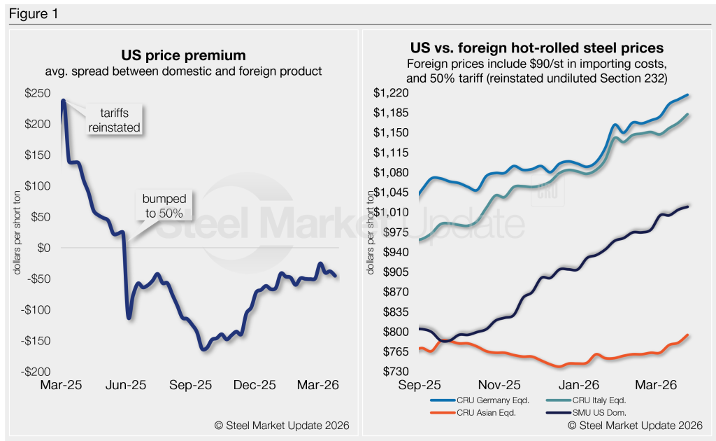 In dollar-per-ton terms, US product is on average $45/st less than landed import prices (inclusive of the 50% tariff), up $7 from a $38/st spread last week.
