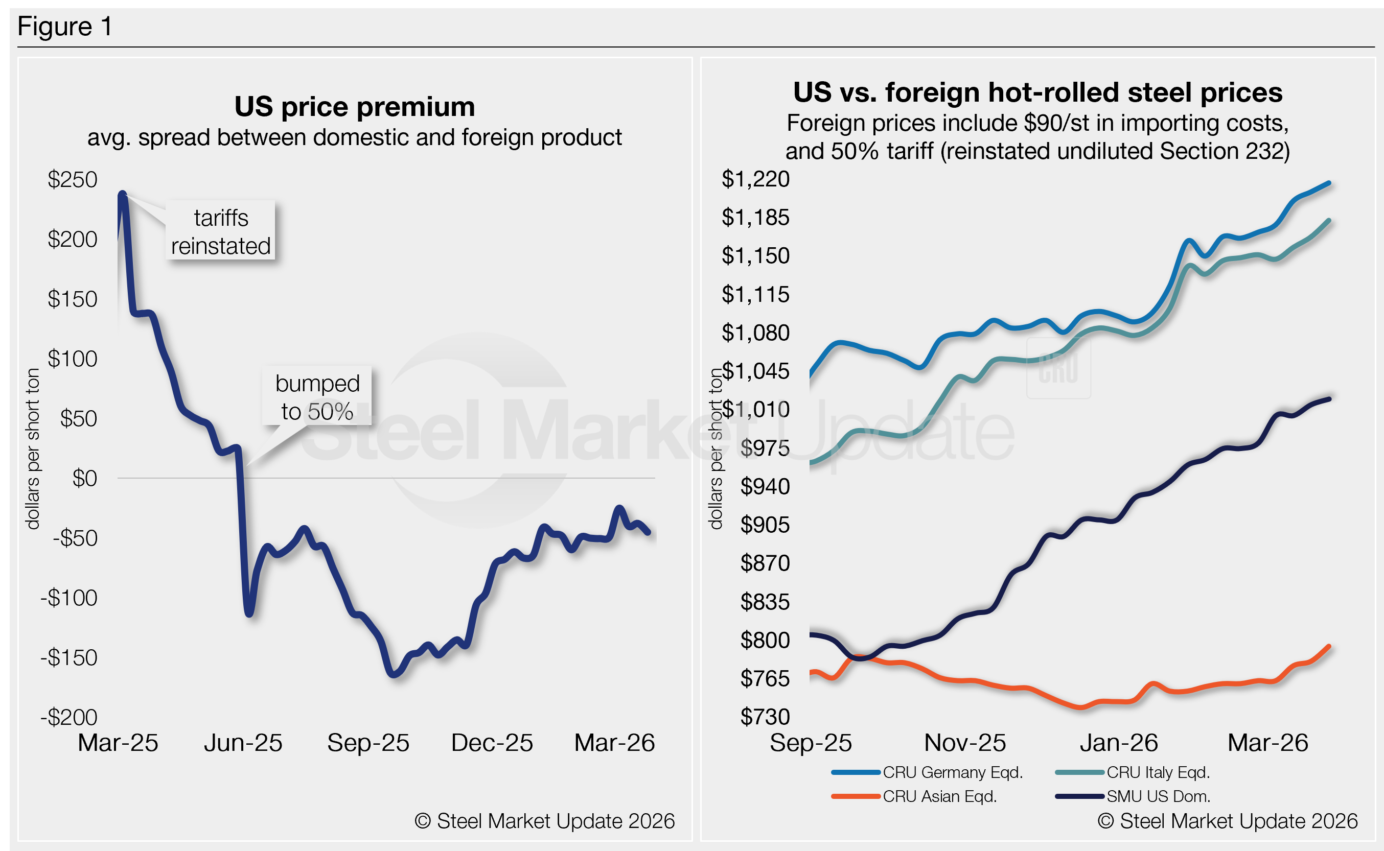 As of Wednesday, March 25, the CRU Asian HRC price was $470/st, up $9/st w/w, and up $21/st over the past month. Adding a 50% tariff and $90/st in estimated import costs, the delivered price of Asian hot band to the US is ~$795/st. As noted above, the latest SMU US HR price is $1,020/st on average.
