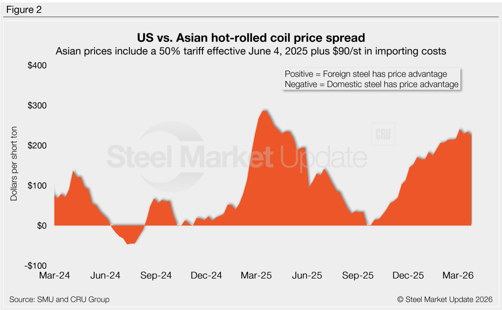 The result: Prices for US-produced HR are theoretically $225/st higher than steel imported from Asia — down ~$9/st w/w.