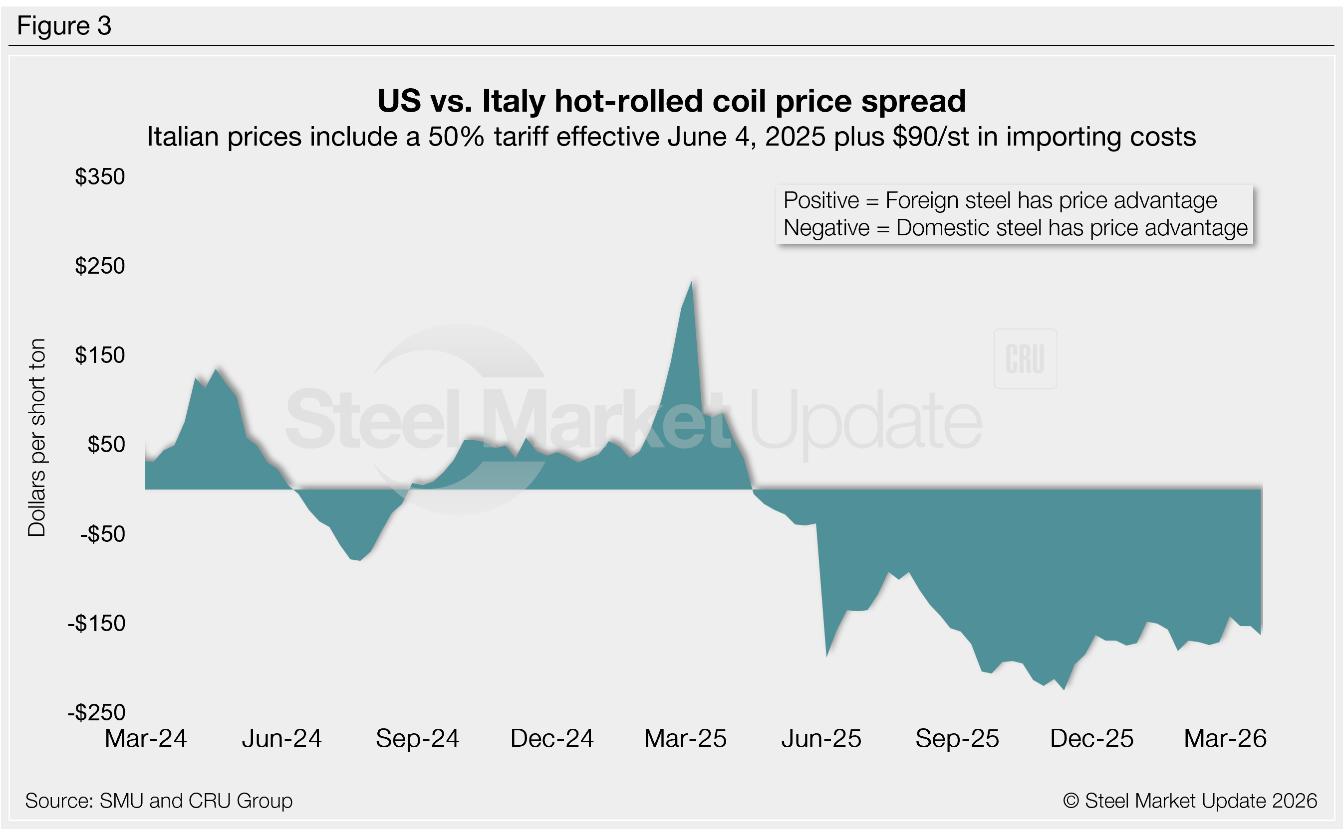 SMU calculates the theoretical spread between domestic (FOB mill) and foreign (delivered to US ports) HR coil prices. We do this by comparing our weekly US HR assessment to CRU’s weekly HR indices for Germany, Italy, and Southeast Asian ports. This calculation is purely theoretical. Actual import costs can vary significantly.