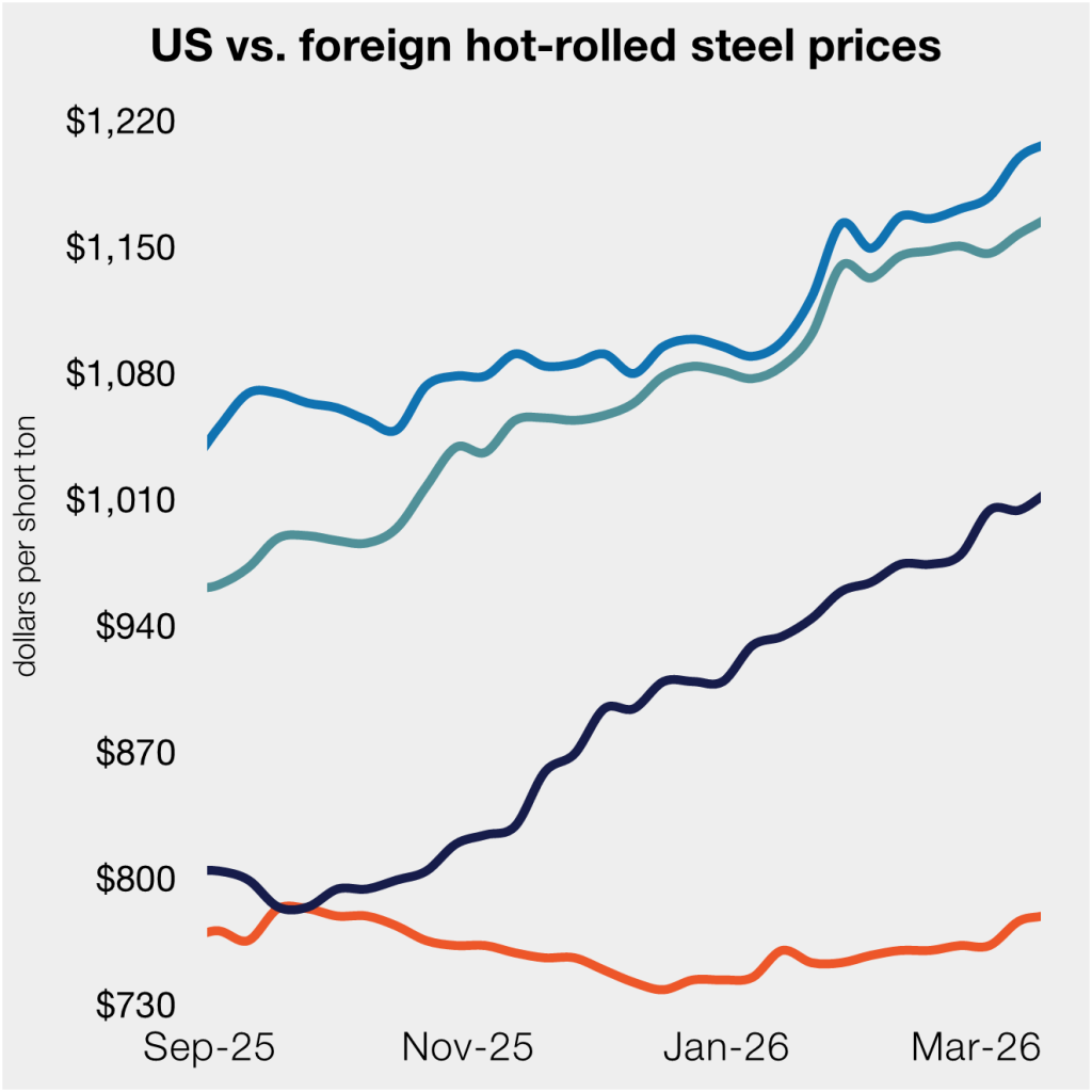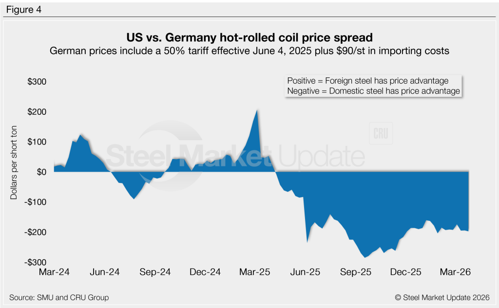 The decisive factor remains the 50% Section 232 tariffs. While imports from Europe are more expensive than domestic material, Southeast Asian products remain at a discount. The dynamic has kept the overall gap tighter since the fourth quarter.