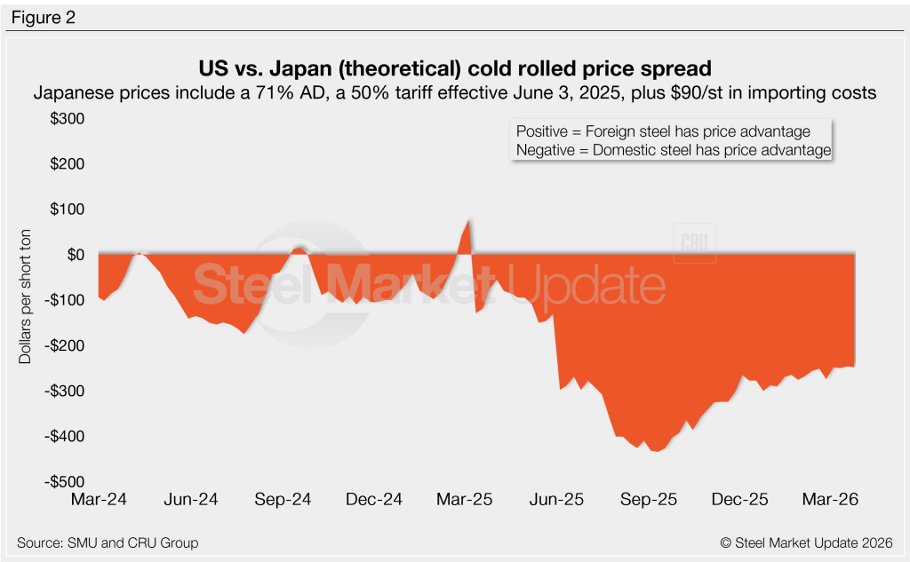 With the latest SMU CR price up $5/st to an average of $1,175/st, US-produced CR is now theoretically $248/st below CR from Japan but $305/st above CR from South Korea.