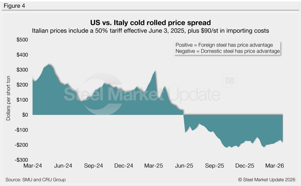 Italian CR prices were $16/st higher this week at $847/st. After adding import costs and a 50% tariff, the price of Italian CR delivered to the US is, in theory, $1,361/st. That means domestic CR is theoretically $186/st cheaper than CR coil imported from Italy.
