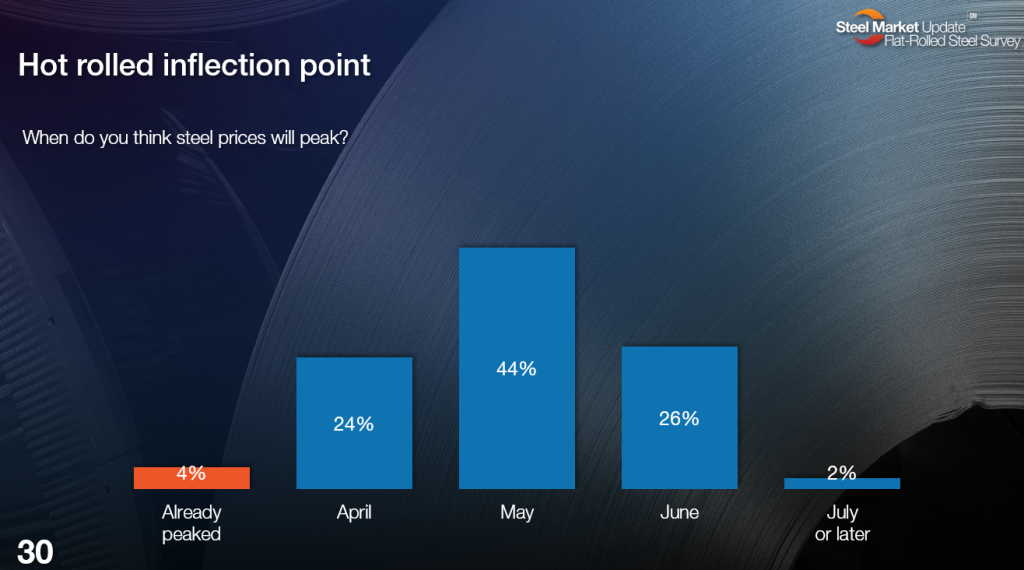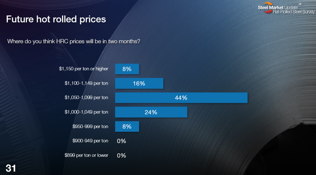 The most common response (44%) is that HR prices will be in the range of $1,050-1,099/st, or slightly above where they stand now. That response implies mills, following practices introduced by Nucor, will continue to nudge prices higher by roughly $5-10/st per week.