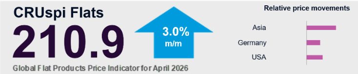 CRU’s Global Flat Products Price Indicator (CRUspi Flats) stands at 210.9 in April 2026, up 3.0% m/m. The Middle East conflict continues to be the principal factor in rising prices, as its impact is now being felt throughout the supply chain. Coated sheet prices have borne the larger brunt of the impact. This is despite there being no evidence of a broad-based demand recovery across the globe.