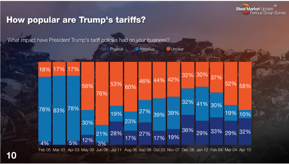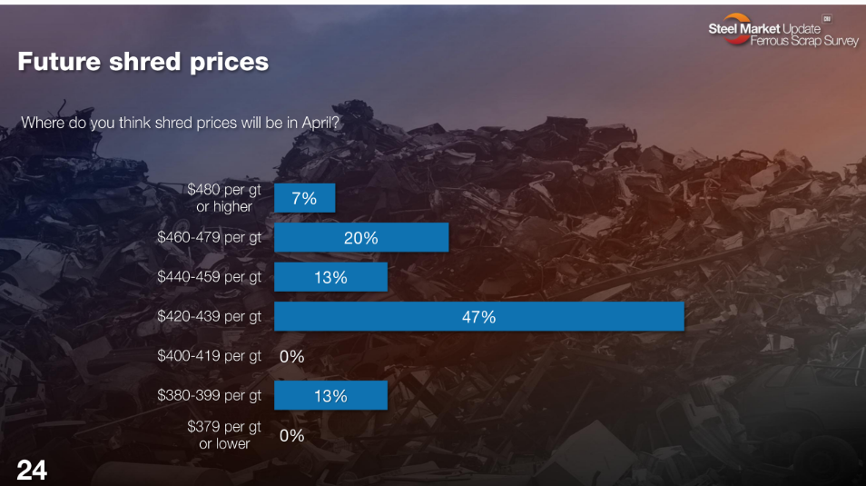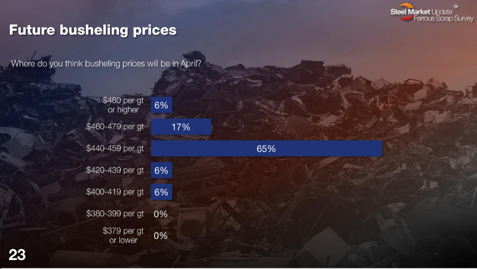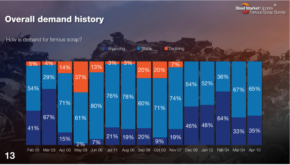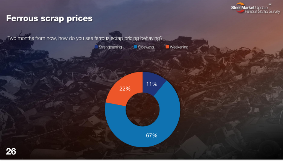 Another reading of note is 67% of respondents signaled their belief that scrap supply vs. demand is now in balance. This is the highest reading since December.