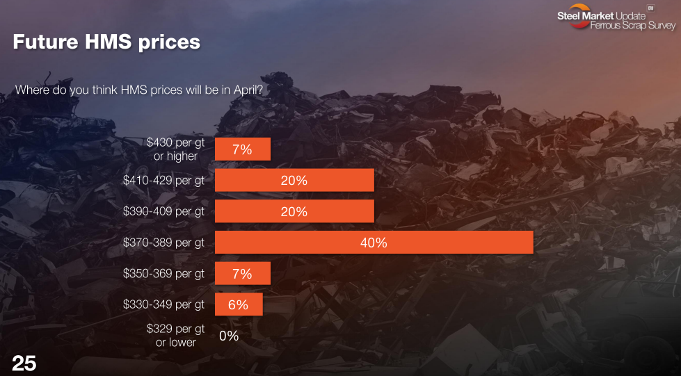 For example, this month’s survey arrived just as the April trade was settling. Last week, SMU reported US scrap tags in April were flat on busheling and down $20 per gross ton (gt) on HMS and shred. The vast majority of survey respondents were spot on, with 68% saying prime scrap prices would settle even with March. However, 21% predicted prices would be up, and 11% thought they would be down.