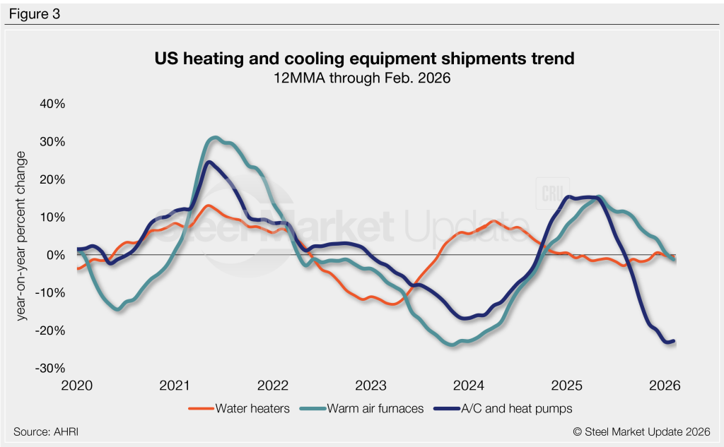The annual growth rate of shipments by product on a 12MMA basis is shown in Figure 3. From this angle, annualized warm-air furnace shipments and water heater shipments are down marginally, while air conditioners/heat pumps shipments are down considerably: