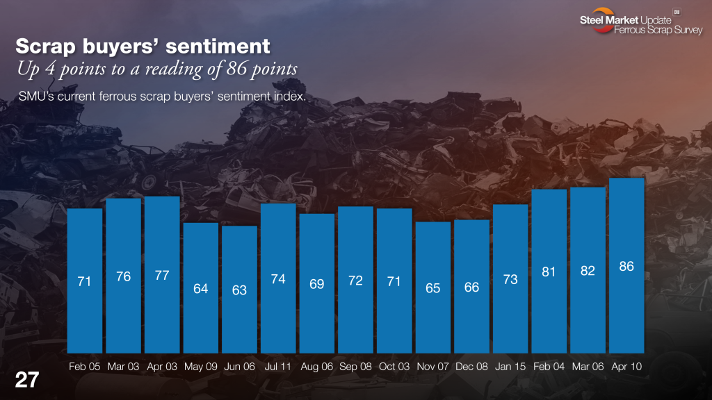 SMU’s Current Sentiment Index for scrap jumped four points from March to +86 this month. This is the highest level of Current Sentiment we’ve seen since we started the survey in February of last year.