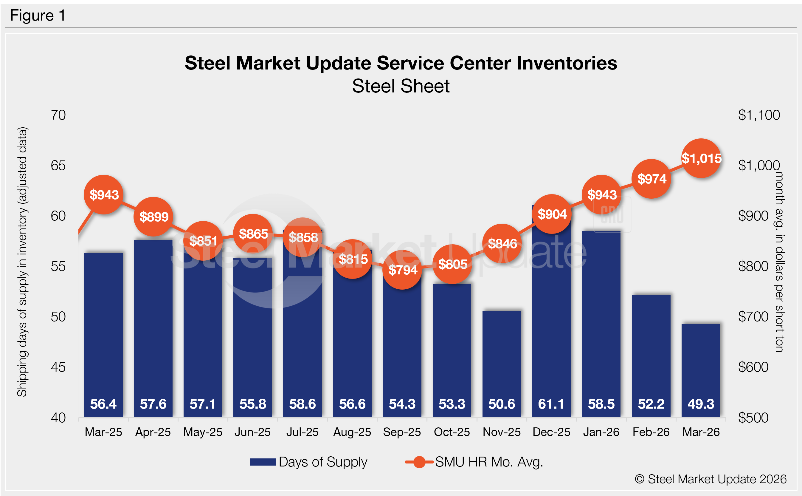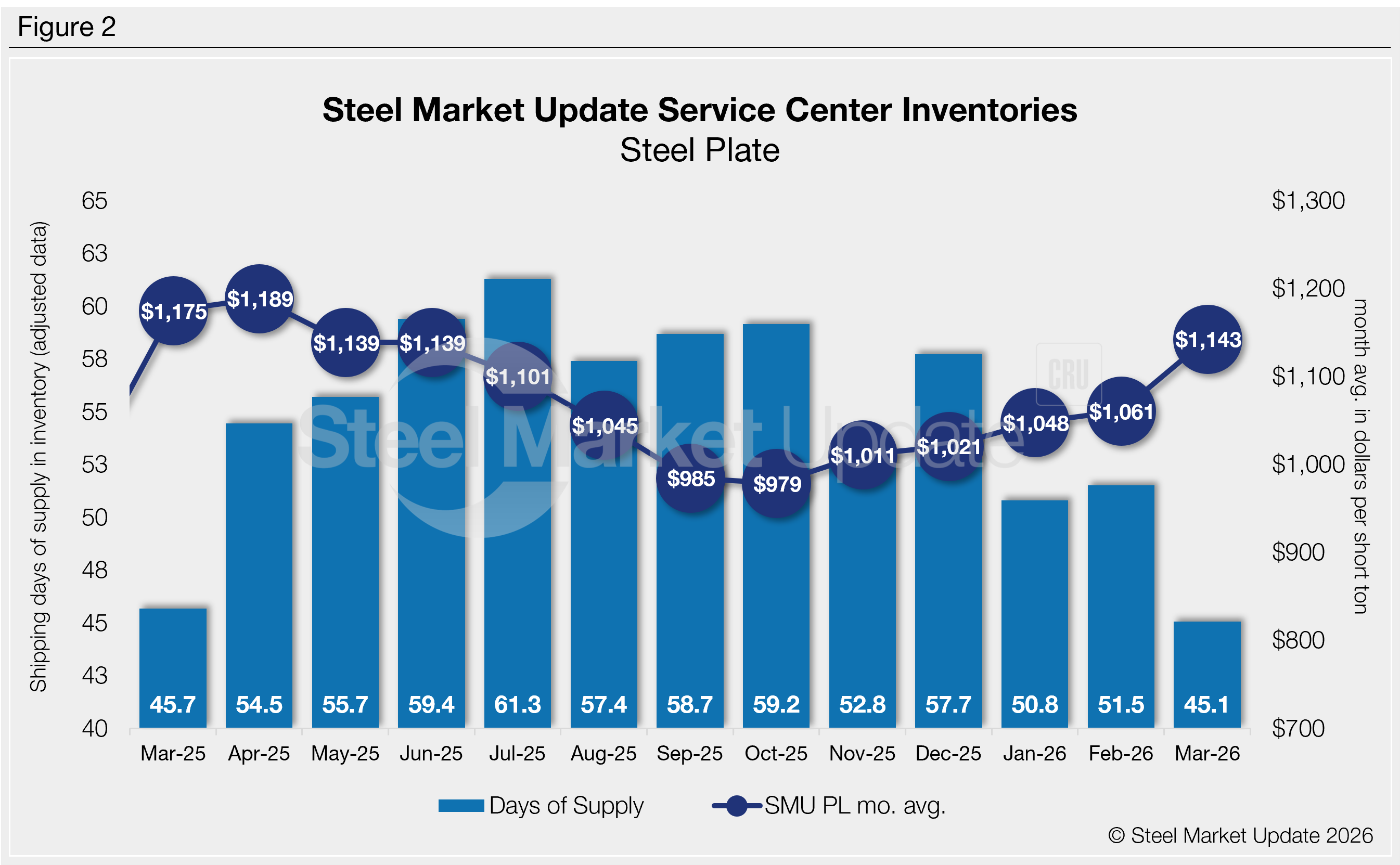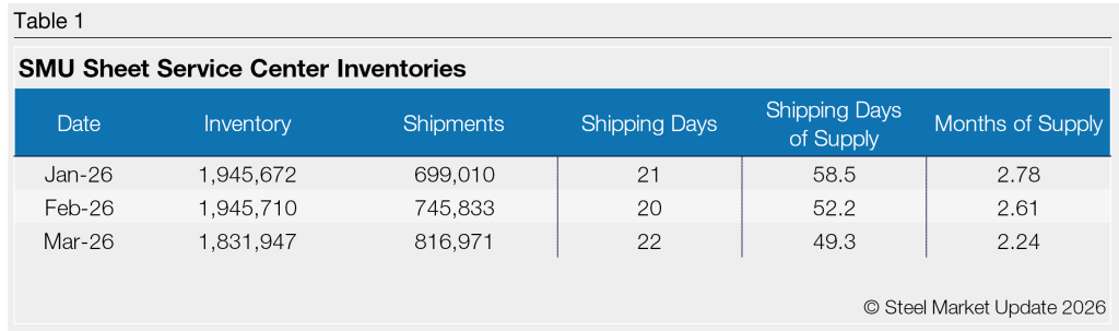 At the end of March, service centers held 45.1 shipping days of supply, down from 51.5 in February. Plate supply in March represented 2.05 months, down from 2.58 months in February.