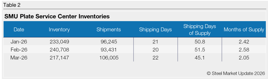 March plate supply was also down vs. year-ago levels, when service centers carried 45.7 shipping days of supply, or 2.18 months of supply.