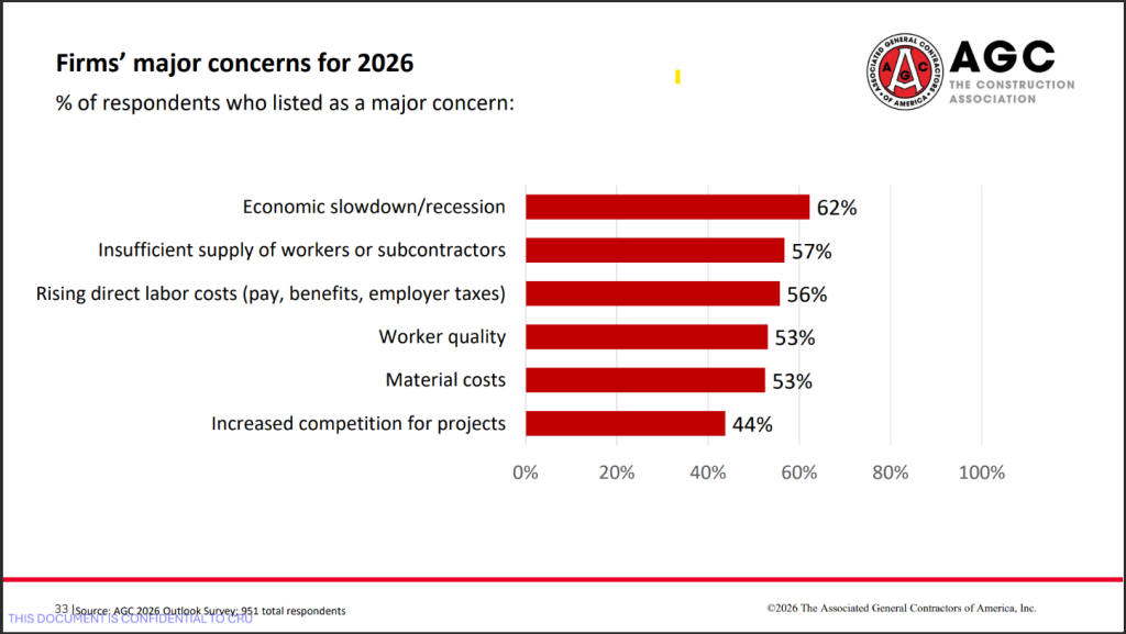 “We also had a substantial minority, 44%, saying they worry about increased competition for projects,” he added. “That fits, since when there’s less to bid on, you expect more firms to come in from other geographic markets, or end markets, or to bid on smaller projects than they would have.”