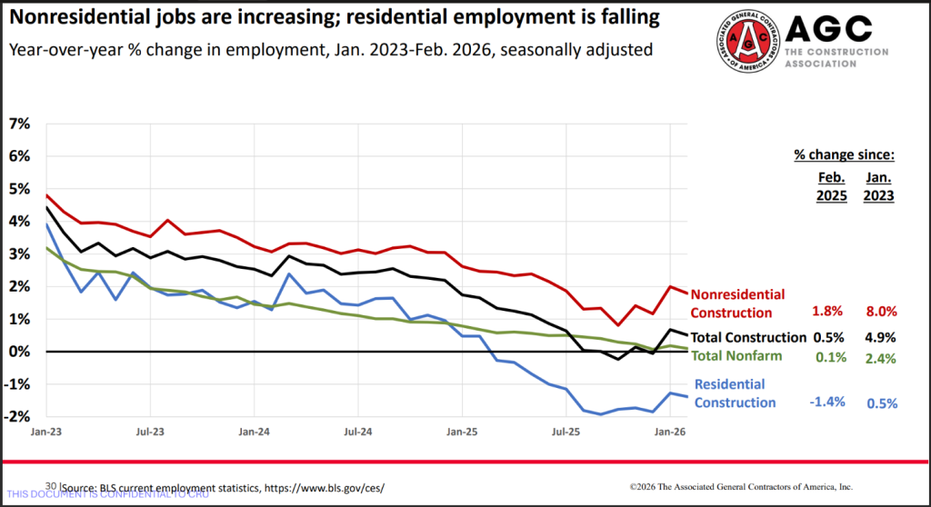 “Residential has been shedding employees on a year-over-year basis since early last year, whereas non-residential firms, that would be general contractors, non-residential specialty trade contractors, and heavy and civil engineering firms, still adding workers at a hefty clip,” Simonson said.