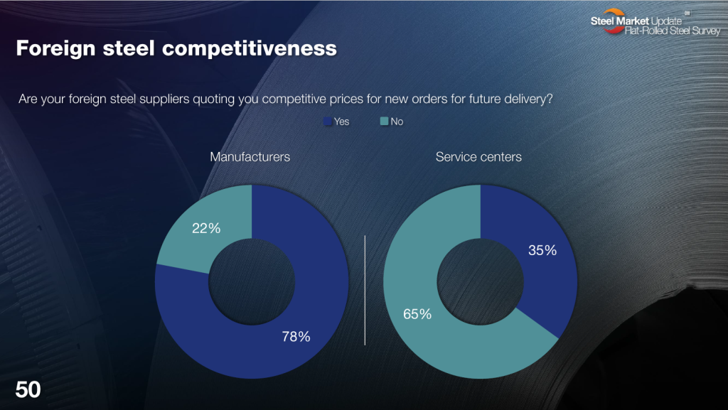 In SMU’s April 17 flat-rolled steel buyers’ survey results, manufacturers reported more favorable foreign pricing than service centers: 78% of manufacturers said foreign suppliers are quoting competitive prices, while 65% of service centers said the opposite, that prices are not competitive (slide 50, below).