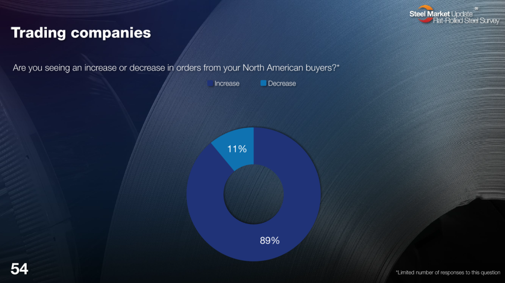 Traders also reported stronger demand from North American buyers, with 89% of those surveyed reporting increased orders (slide 54, below), up from 57% the previous week. One trader mentioned there is “more interest in all products now, including imports.”