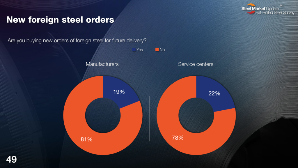 However, a majority of manufacturers (81%) and service centers (78%) surveyed said they are not placing new foreign steel orders for future delivery (slide 49, below). Long lead times and tariffs remain deterrents. Of note, the number of service centers reporting making new foreign steel orders increased by five percentage points from the previous week to 22%.