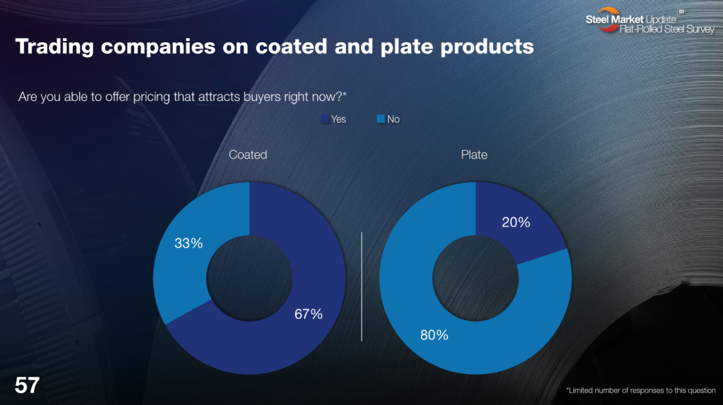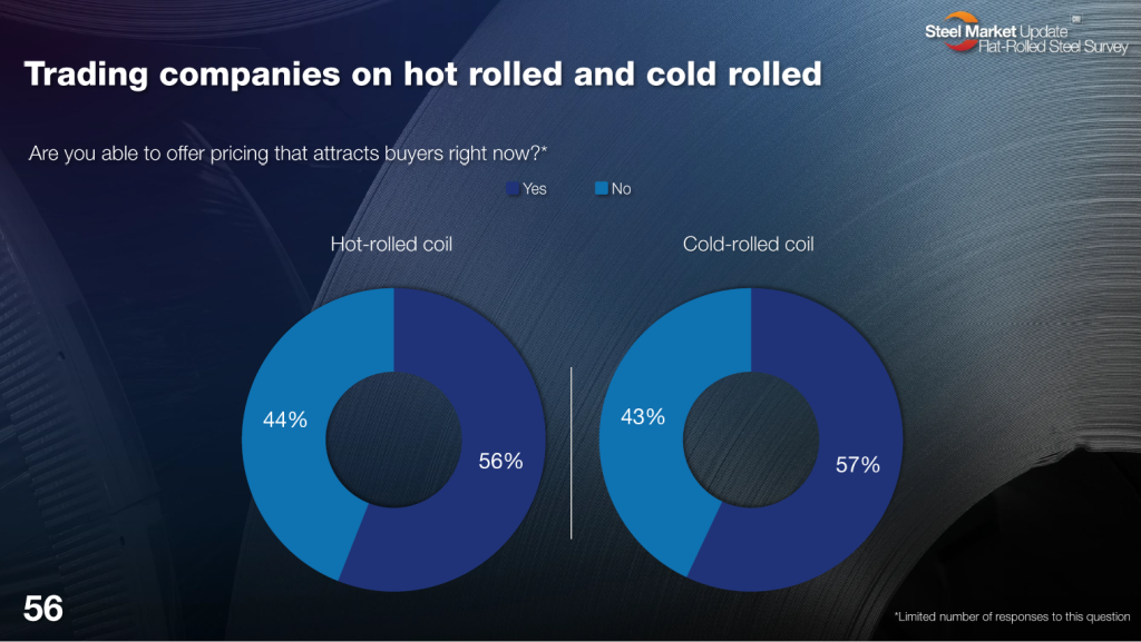 On hot rolled, 56% of traders said they can offer attractive pricing, with one trader reiterating, “Demand for hot rolled is strong.” For cold rolled, 57% of traders surveyed said their prices are competitive, though one trader noted Korean mills remain the most attractive. (Slide 54, below.)