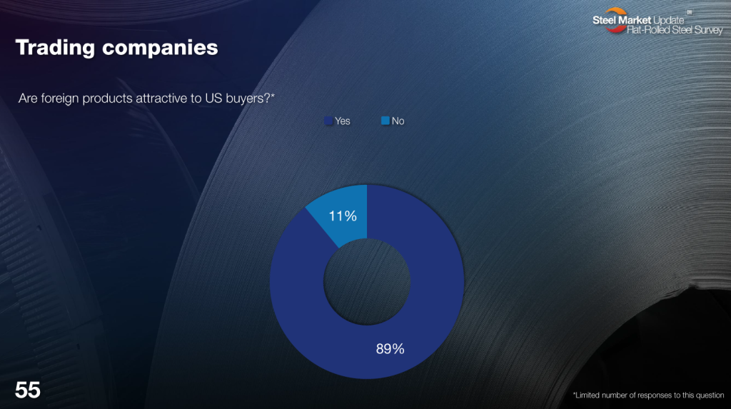 Still, foreign products remain broadly attractive to US buyers – 89% of traders said yes, their offers are attractive. But product differentiation matters. As one trader put it: “Bare galvanized is not. Pre-painted and hot rolled, yes.”
